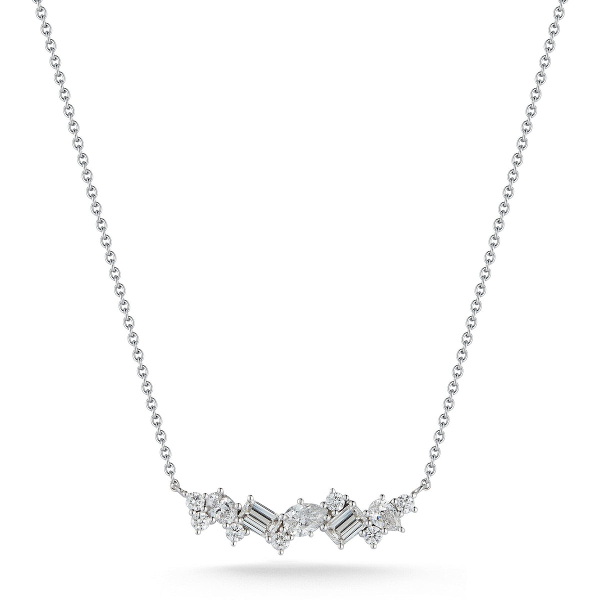 This isn't just any pendant; it's a symphony of sparkle. Crafted in luxurious 18K white gold, this bar pendant showcases a stunning array of multi-shaped diamonds—think round, marquise, and pear cuts—all totaling a dazzling 1.24 carats. It's like wearing a constellation around your neck, minus the need for a telescope.