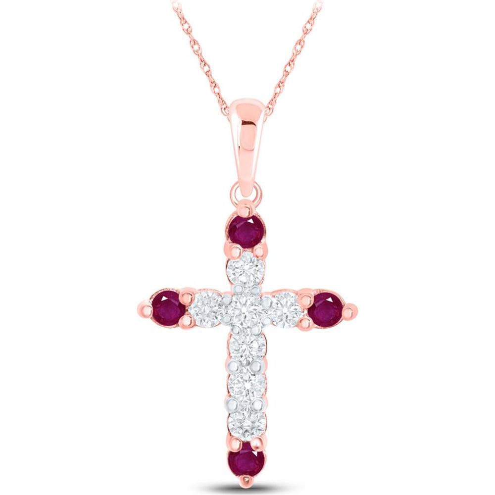 10K Rose Gold Cross Pendant with Round Rubies and Diamonds - 1/4 Carat Total Gemstone Weight