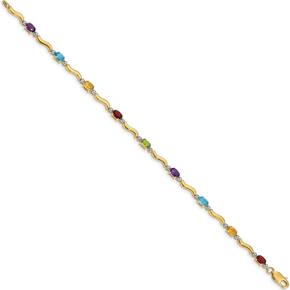 Simplify your style with sophistication in this captivating 10K Diamond and Rainbow Gemstone Bracelet. A piece that elegantly blends vibrant color and timeless luxury, it is designed to add a dash of whimsy to any occasion. The bracelet features a harmonious sequence of gemstones, each carefully selected for its striking hue. From the green of peridot to the deep red of garnet, the rainbow of stones will catch the light from every angle, creating a dazzling display of color. Each stone is nestled in a prong setting, securely held in place by the enduring shine of 10K yellow gold.