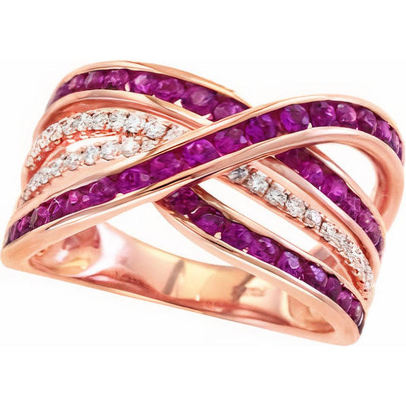 Unveil a world of elegance with this stunning 14K EFFY Rose Gold Ruby Crossover Ring, where luxury meets artistic allure. Embodying a lavish yet contemporary style, this crossover design features lustrous rubies with a total weight of 1.22 carats, gracefully intertwined with shimmering diamond accents totaling 0.25 carats. Crafted in polished 14K rose gold, each gem is meticulously set to enhance its fiery hue and sparkling companions. The crossover pattern not only symbolizes a path of entwined destinies but also adds a sophisticated visual twist to this piece, making it a perfect blend of modern art and timeless romance.