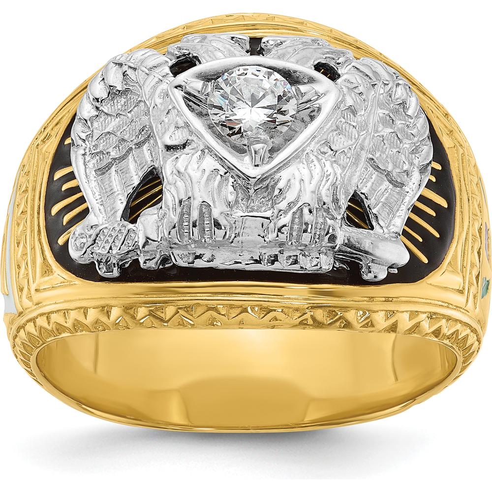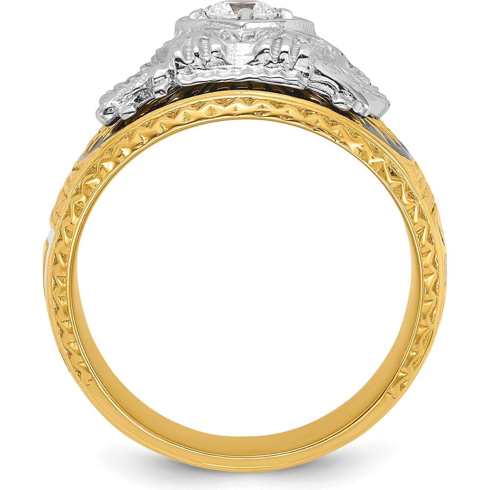 A bold statement of strength and sophistication, this exquisite ring embodies a design that’s both intricate and commanding. The 14K Two-tone Men's Polished and Textured 32nd Degree Scottish Rite Masonic Ring Mounting is a masterpiece that speaks to the soul of those who honor tradition yet embrace modern elegance. With its dramatic two-tone gold design, it creates a stunning contrast between polished gold and textured accents, enhancing the ring's visual depth. At the center of the design sits a striking diamond, its radiant sparkle a symbol of clarity and unwavering resolve. The details of the Scottish Rite symbolism, with its finely crafted eagle and sharp lines, give the piece a powerful sense of purpose and distinction. This is not merely a ring—it's a badge of honor, a wearable representation of personal achievements and timeless tradition.