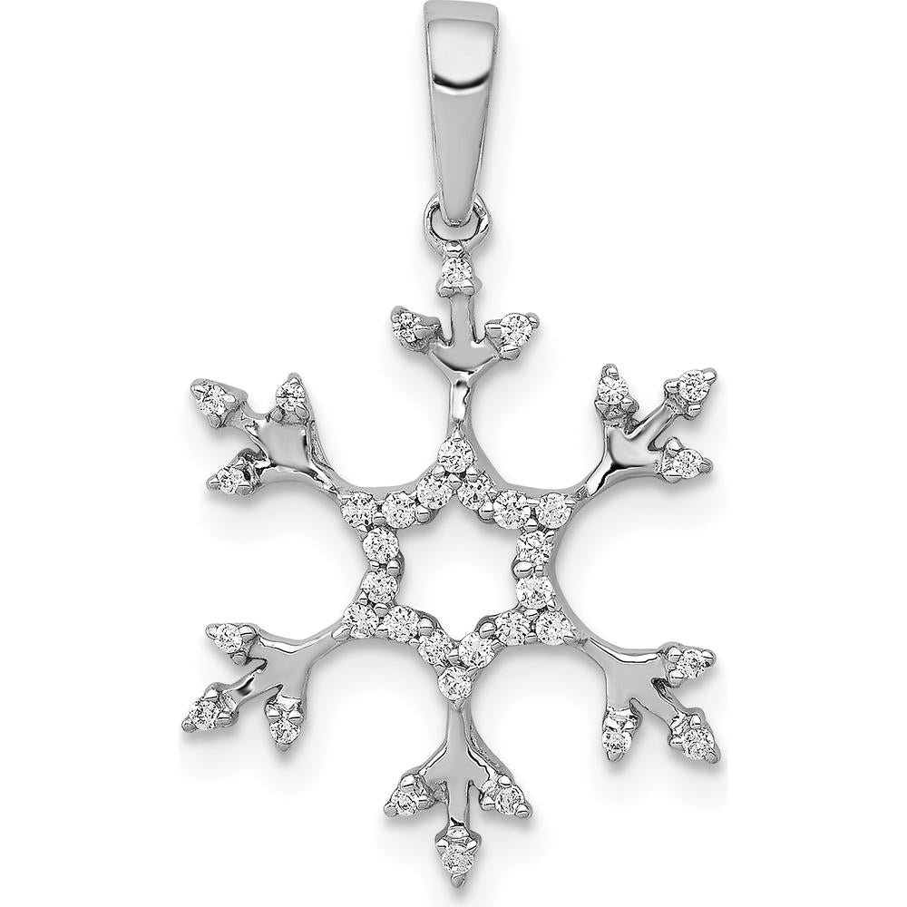 The intricate snowflake design, with its open back profile, offers a look that is both timeless and modern. At 19.3mm in length and 14mm in width, this pendant is a versatile accessory, easily complementing both casual and formal outfits. Its lightweight feel makes it a comfortable addition to your collection, ideal for everyday wear or special occasions. The stunning symmetry of the design invokes feelings of winter's serene beauty, while the radiant diamonds add a touch of glamour that will catch everyone's eye.