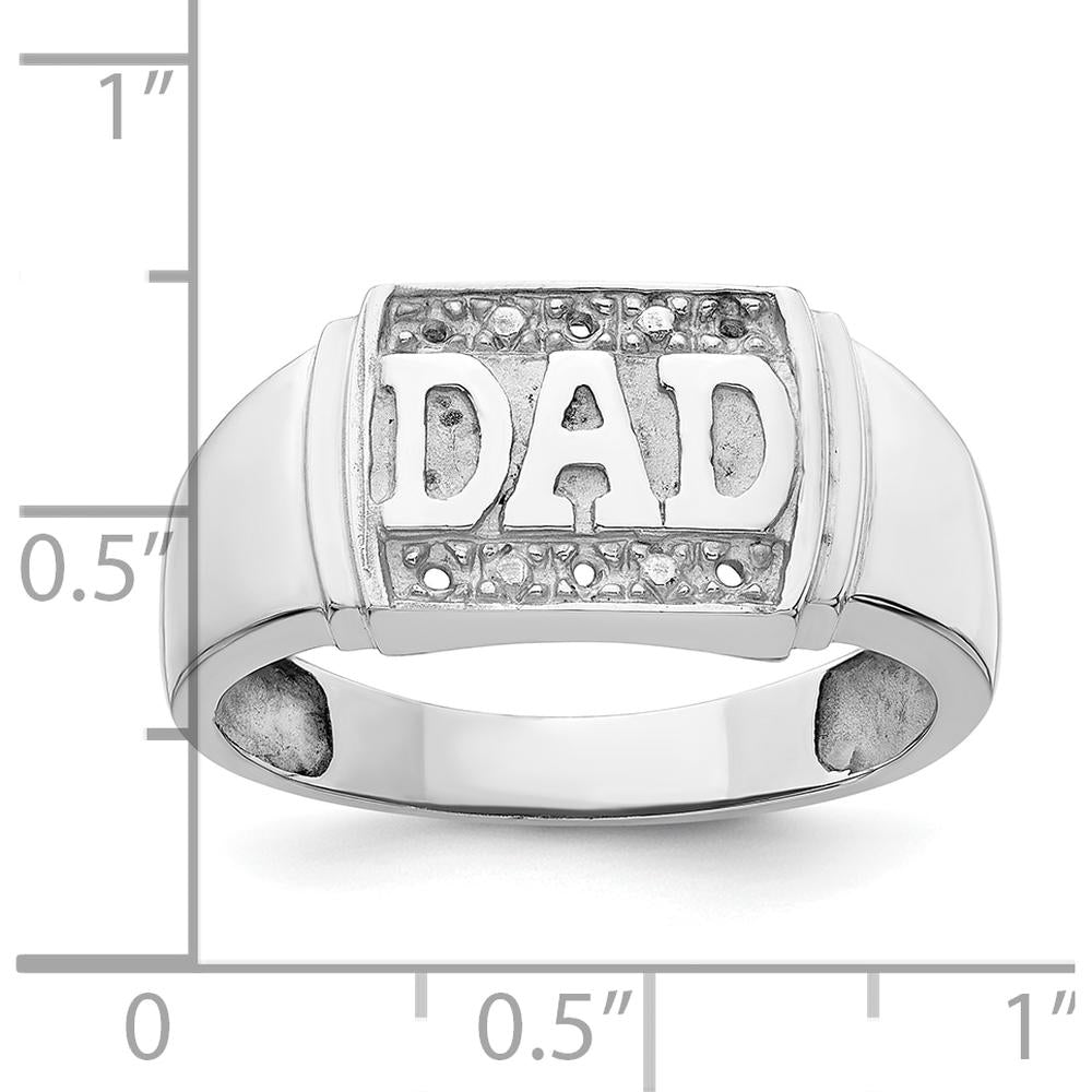 The ring top features a striking 11mm length and 14mm width, creating a substantial presence that commands attention. Six round stone mountings, each designed to hold 1.1mm stones, surround the word "DAD" engraved in bold, sleek lettering. This theme is not just a statement but an emotional connection—each detail etched in place to honor the special man in your life. Whether worn as a gift for a father or as a personal statement of pride, this mounting is designed to evoke feelings of admiration and love. With a band width tapering from 3mm to 9mm, it offers a comfortable fit for everyday wear. Its rhodium plating ensures a brilliant, polished look that won’t fade over time, adding a touch of luxury that shines brightly with each passing year.