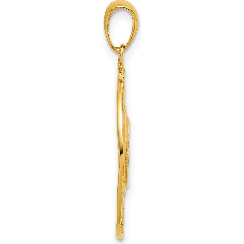 The charm measures a graceful 31mm in length and 22mm in width, making it the perfect statement piece to add to your collection. With its open back design and solid build, this pendant ensures both durability and elegance, while the polished finish brings out the brilliance of the 14K gold. The diamond-cut texture gives this piece a unique, shimmering appeal, creating an enchanting play of light. Whether worn alone or added to a favorite chain, this piece is a stunning homage to the timeless beauty of the stars above.
