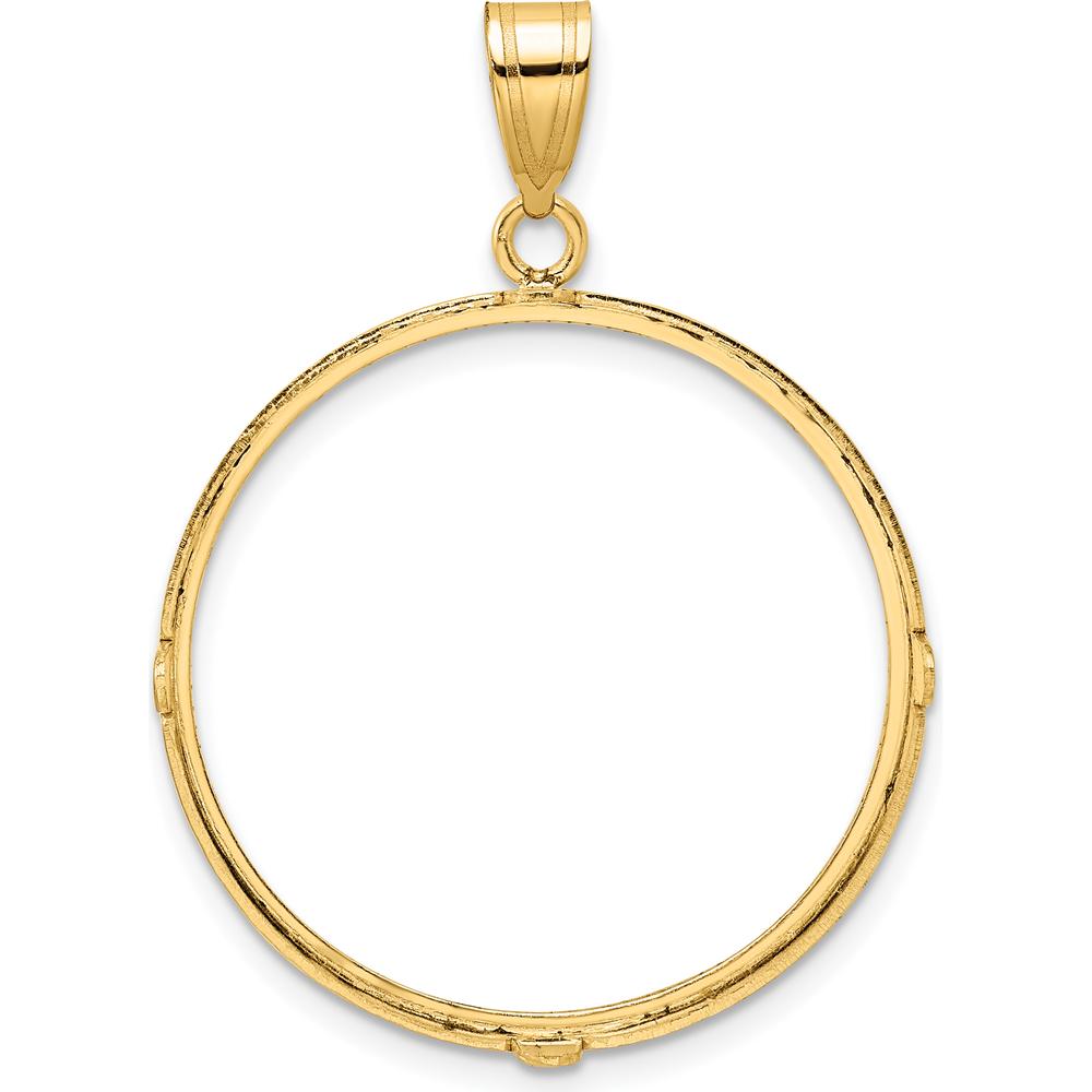 A quiet radiance, perfectly poised… This 14K Yellow Gold Distinguished Coin Jewelry Pendant is a statement piece like no other. With its striking, polished finish and diamond-cut texture, this pendant exudes luxury while maintaining an effortless elegance. Designed to hold a 1/2oz American Eagle coin (sold separately), its 27mm prong coin bezel offers a unique, timeless appeal.