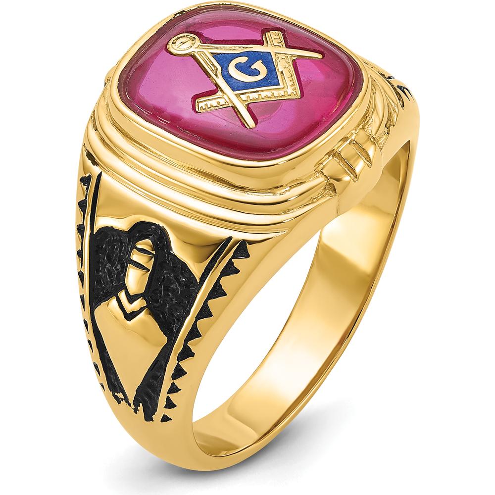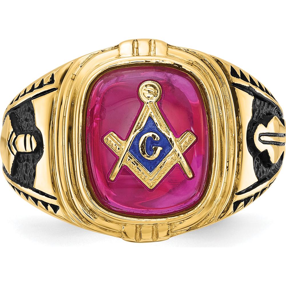 14K Yellow Gold Masonic Ring with Black Enamel and Lab Created Ruby - 12x10mm Cushion Cut - Size 10 by IBGoodman