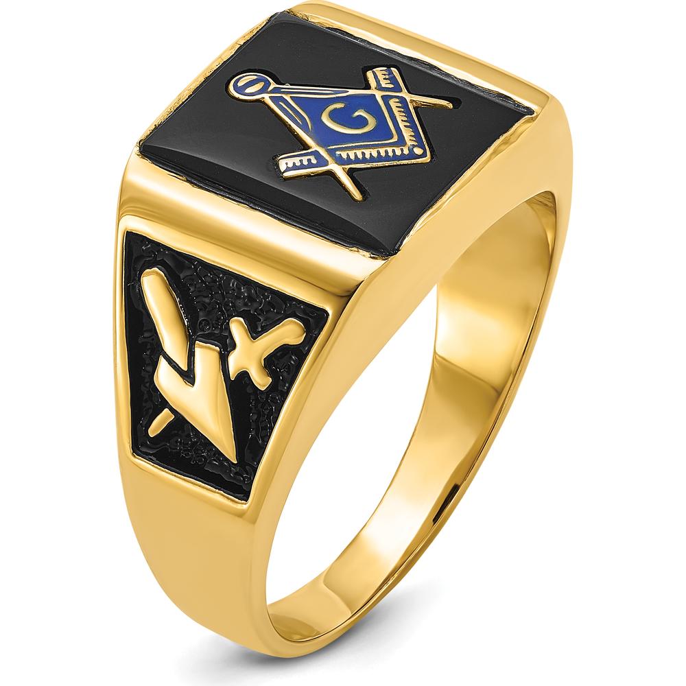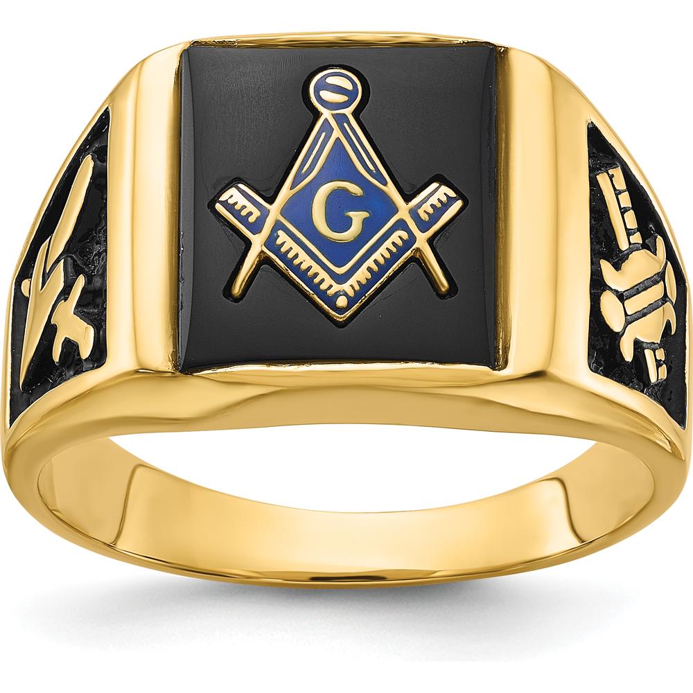 14K Yellow Gold Masonic Ring with Cushion-Cut Black Onyx and Enamel Detailing - Size 10 by IBGoodman