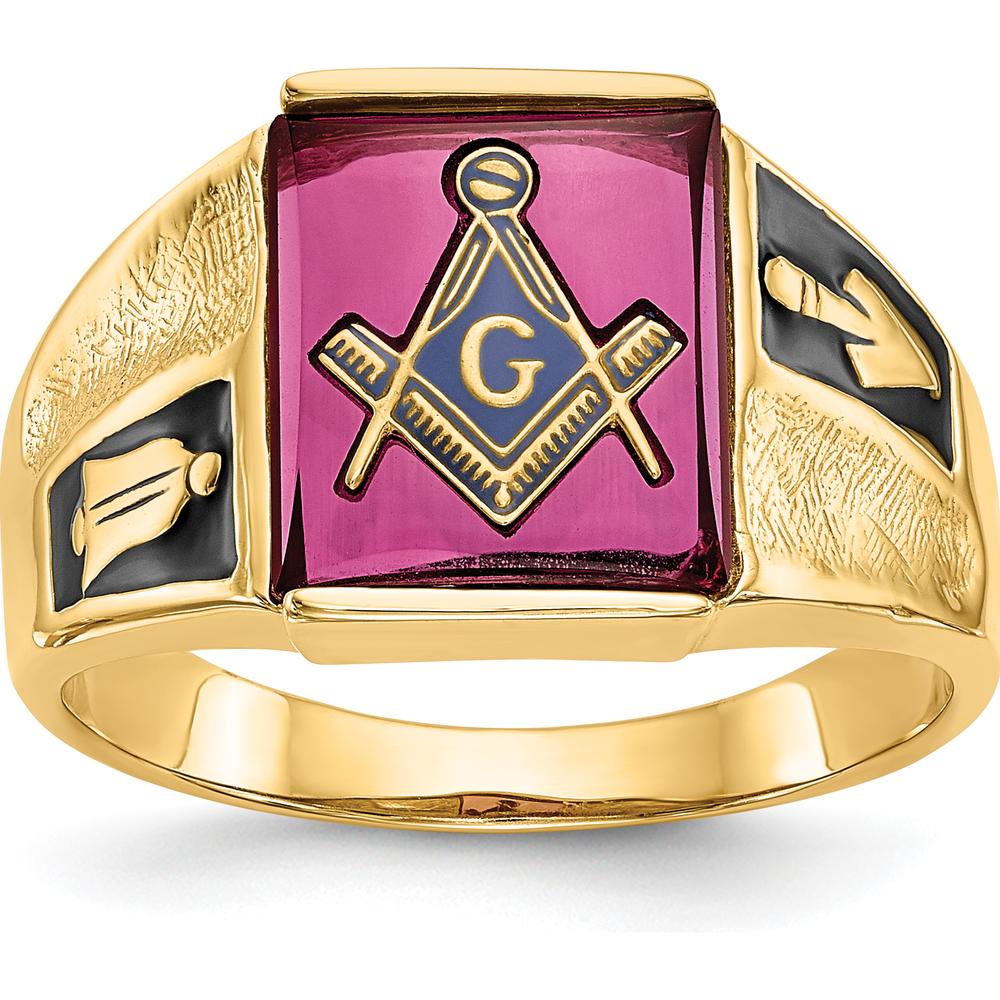 14K Yellow Gold Masonic Ring with Lab Created Cushion-Cut Ruby and Black Enamel Accents - 12x10mm - Size 10 by IBGoodman