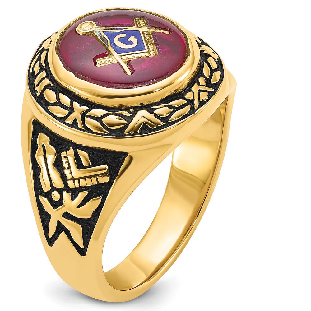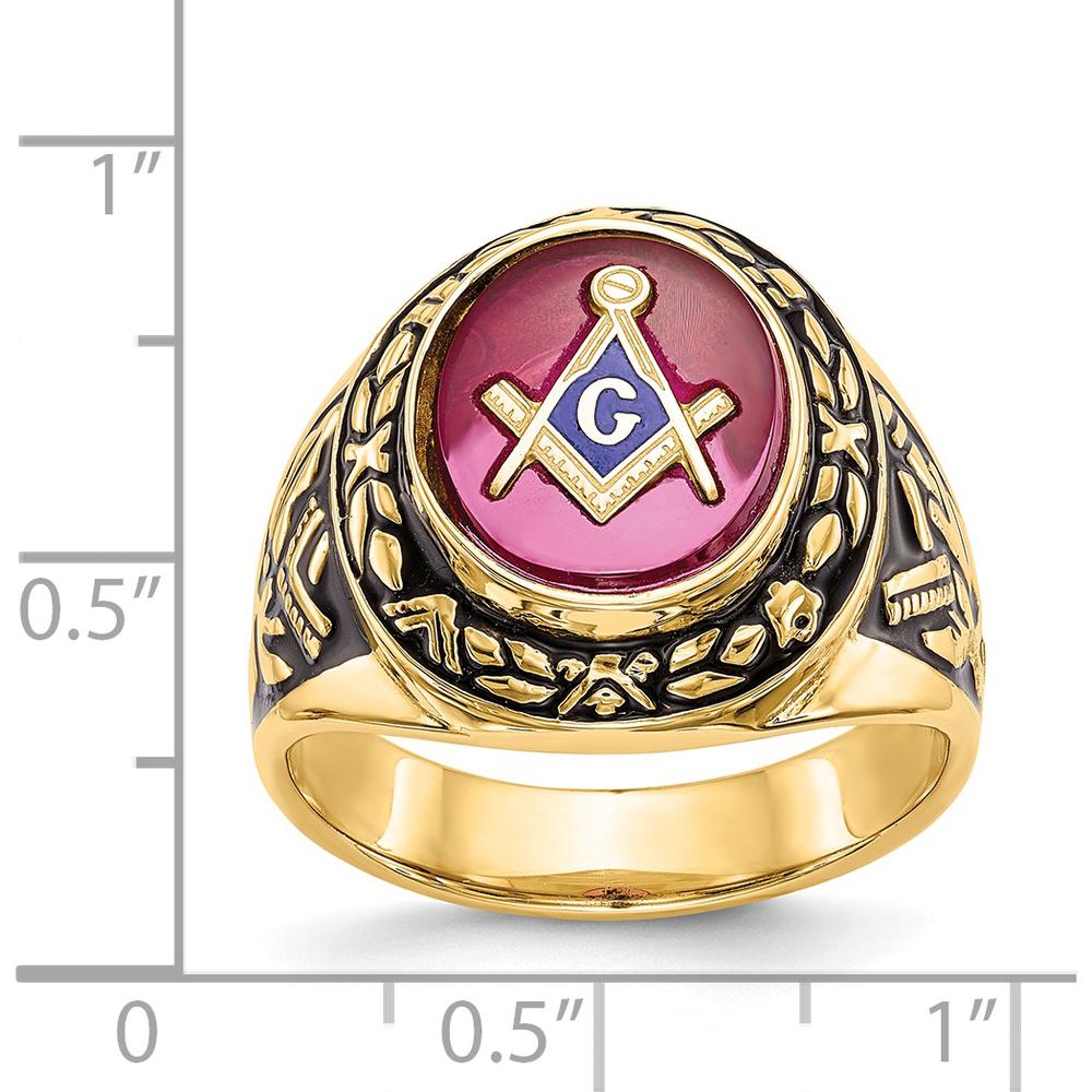 14K Yellow Gold Men's Masonic Ring with 12x10mm Oval Lab Created Ruby and Antiqued Detailing - Size 10 by IBGoodman