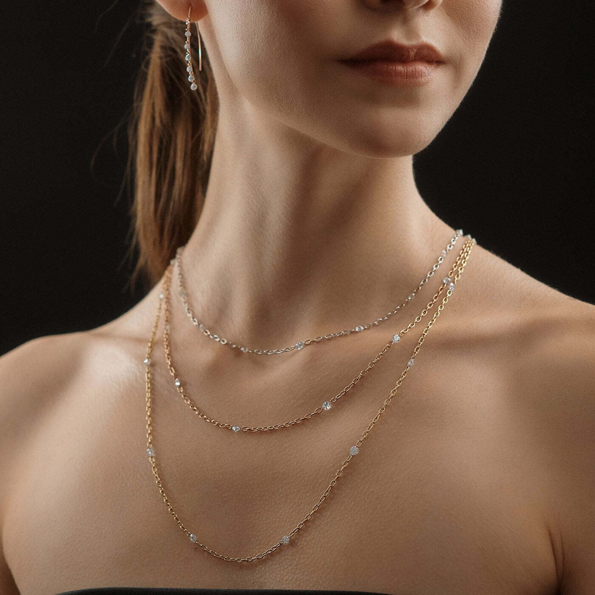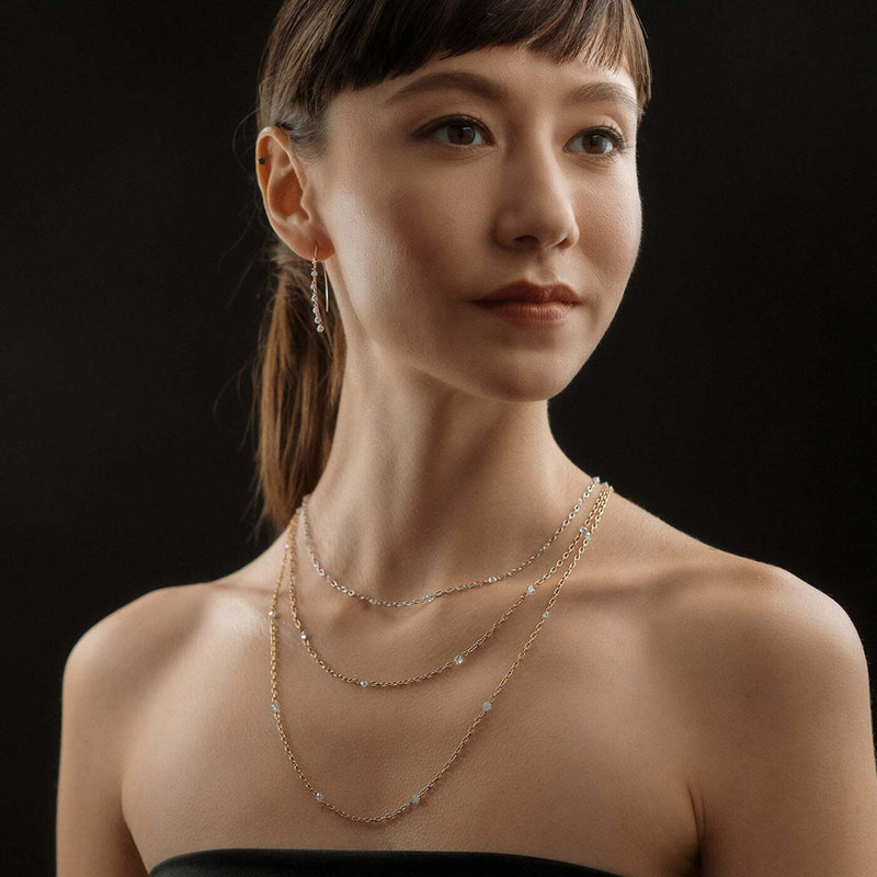 Are you ready to shine bright like a diamond? ARESA New York's Georgia No. 9 station necklace is the epitome of luxury and style. Featuring 9 round diamonds with a total carat weight of 1.95, this necklace is sure to turn heads. The oval links and wraparound design add a modern twist to the classic diamond station necklace.
