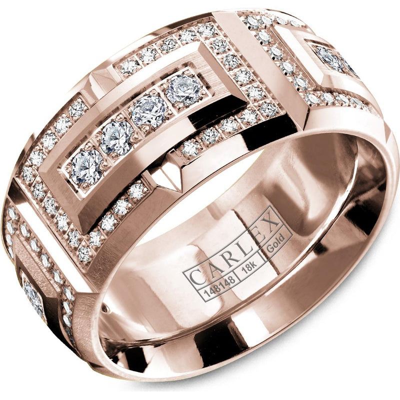 This Carlex G2 Collection Men's Wedding Band in luxurious 18K rose gold is truly a statement piece, radiating modern sophistication with a bold architectural design. The moment you slip this band on, you’ll feel its strength and refined elegance. Crafted from warm 18K rose gold, this band features a striking 10mm width that gives it substantial presence while still exuding comfort. The mesmerizing geometric details are accented by dazzling rows of round brilliant diamonds, meticulously set to catch the light from every angle, adding a flash of brilliance to the rose gold’s understated glow.
