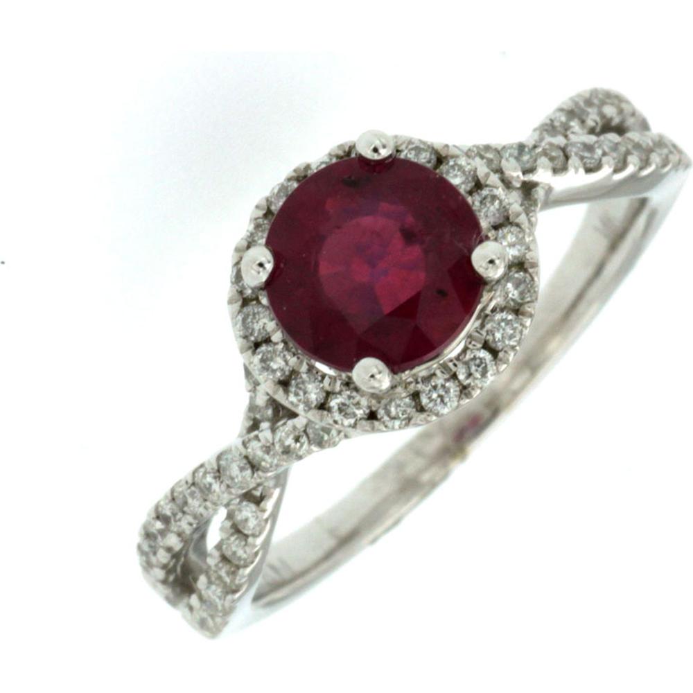 Orbit the opulence of originality in this stunning 14K White Gold Diamond & Glass Filled Ruby Ring from Royal. Crafted with meticulous attention to detail, this ring exudes elegance and sophistication, making it the perfe carat statement piece for any occasion. The centerpiece of this ring is a brilliant round-cut diamond, weighing 0.30 carats, nestled amidst a halo of vibrant glass-filled rubies totaling 1.40 carats. Set in lustrous 14K white gold, the contrast between the sparkling diamonds and the rich red hue of the rubies creates a captivating visual display.