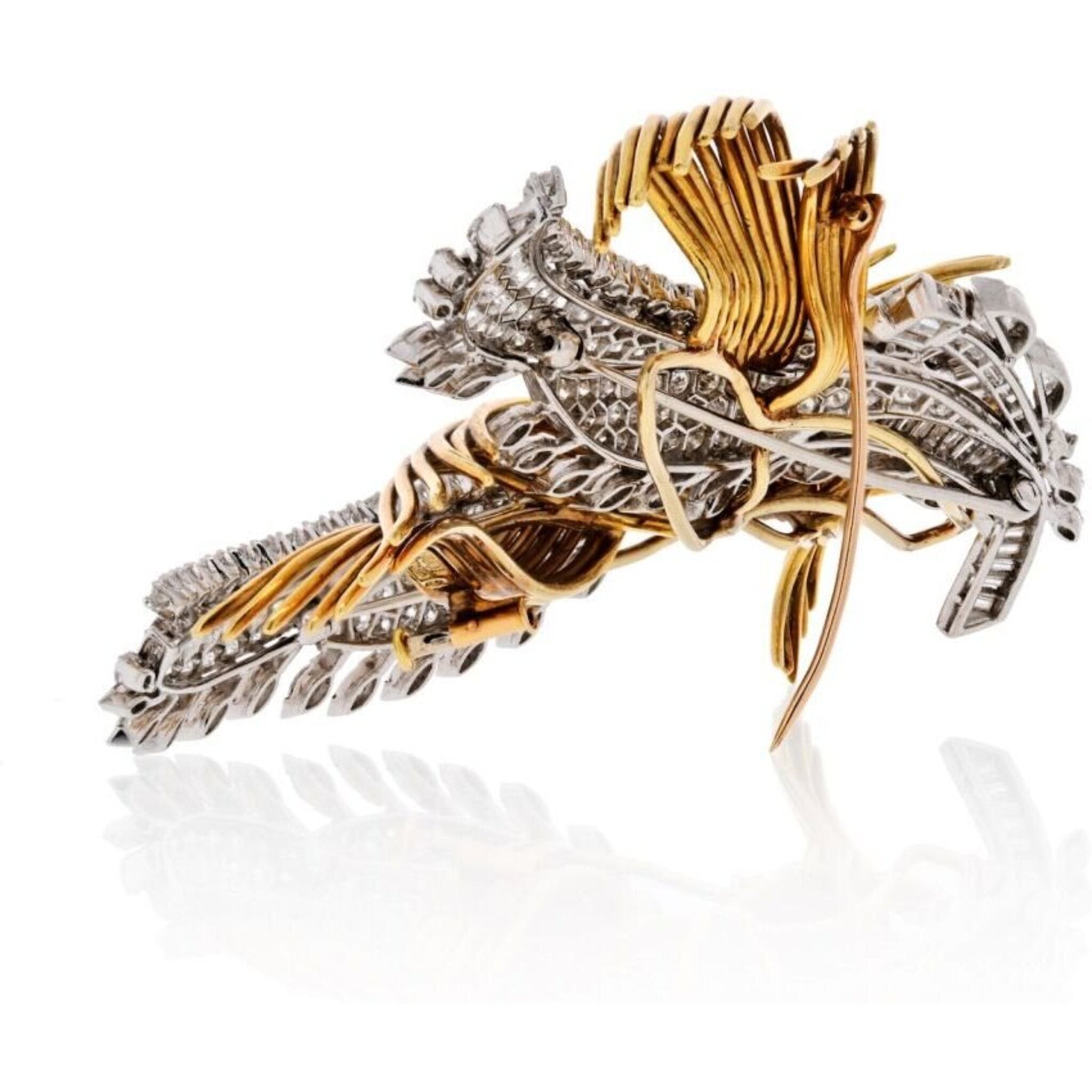 Meticulously crafted in 18K Yellow Gold and Platinum, this brooch is adorned with a stunning array of mixed cut diamonds. The sparkle of emerald cuts, baguettes, round cuts, and marquise cuts collectively adds up to an astonishing 20 carats. The center diamond itself weighs an impressive 20.00 carats, stealing the spotlight with its unparalleled brilliance.