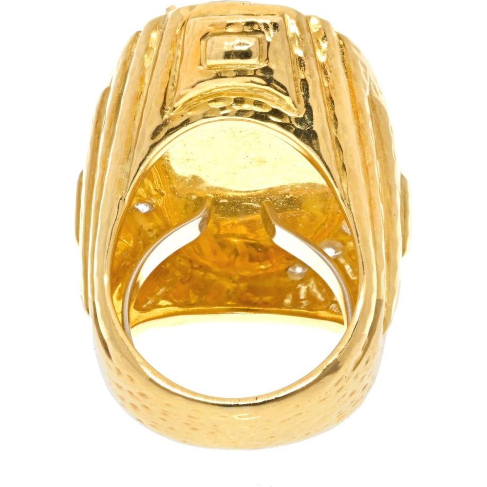 - Other Details: An absolutely fantastic jade ring by David Webb! This gorgeous piece, which is particularly substantial in size, is crafted in buttery 18kt yellow gold and features a plaque of jade in the center framed by diamond set textured gold. Jade is carved and depicts a lovely design. The stone is prong set and exhibits a luscious apple green color. Completing the design is a yellow gold frame with an ancient hammered motif, and each shoulder is graced with a few round cut diamonds. A very special David Webb ring, it has an impressive appearance when worn and would make a striking addition to your ring collection!
