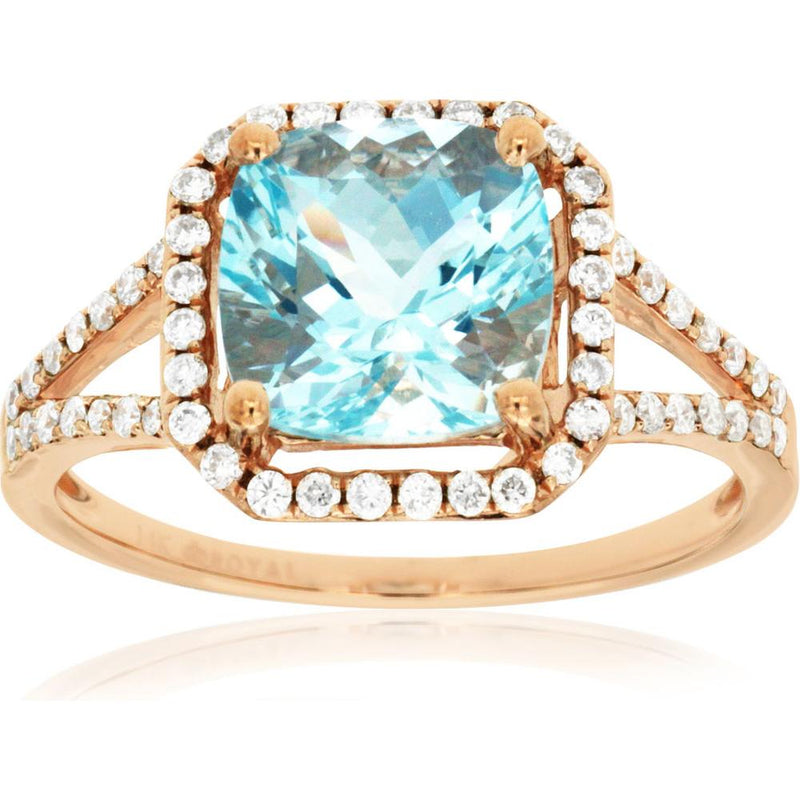 Unveil the elegance of the ethereal with this 14K Rose Gold Aquamarine & Diamond Ring from Royal. Imagine slipping this enchanting piece onto your finger, feeling the delicate embrace of rose gold as it cradles a stunning 1.80 carat cushion-cut aquamarine at its center. The aquamarine, with its soothing blue hue reminiscent of tranquil waters, is accentuated by a halo of brilliant diamonds, totaling 0.30 carats, adding a captivating sparkle to this already mesmerizing ring. Crafted with meticulous attention to detail, this ring embodies grace and sophistication, making it the perfe carat accessory for any occasion. Whether worn as a symbol of self-love or given as a heartfelt gift, this ring is sure to evoke admiration and envy wherever it goes.