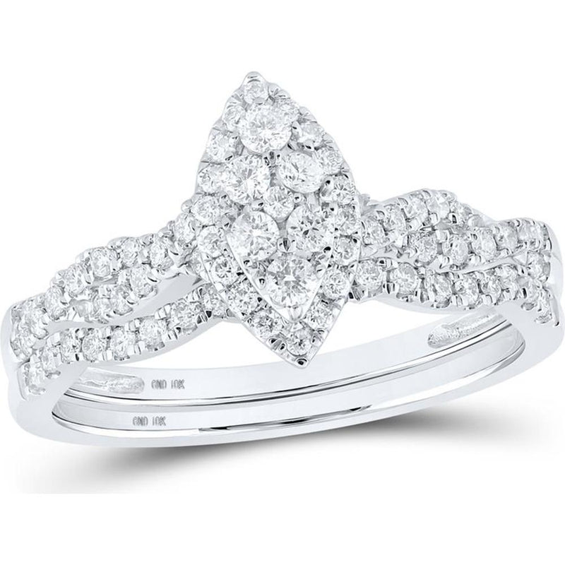 GND 10K White Gold Bridal Wedding Ring Set with Prong-Set Round Diamond Cluster - 1/2 Carat Total Diamond Weight