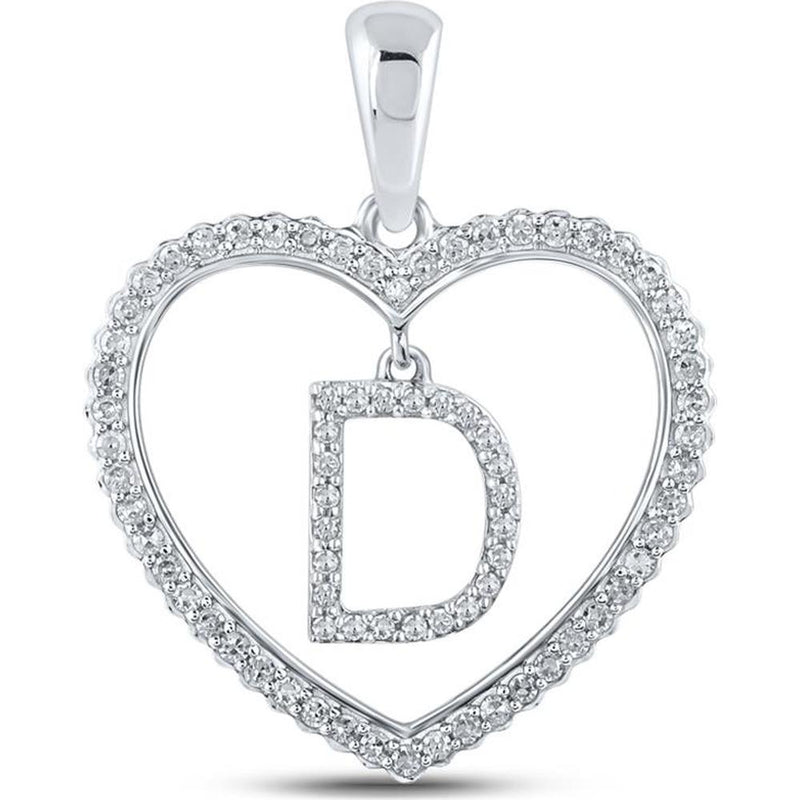 GND 10K White Gold Heart-Shaped Pendant with Prong-Set Round Diamonds and Suspended D Initial - 1/4 Total Carat Weight