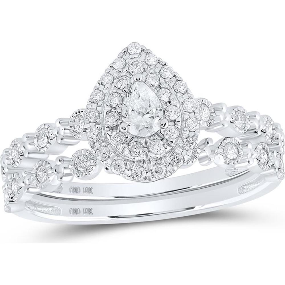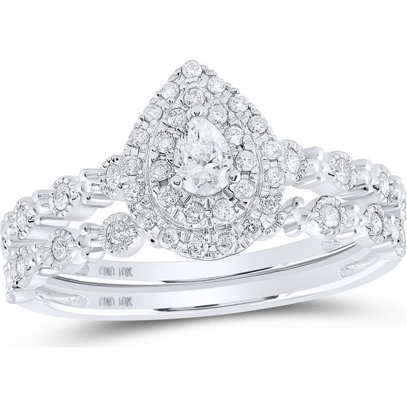 GND 10K White Gold Pear Diamond Halo Bridal Wedding Ring Set with Bezel-Set Round Diamonds - 3/8 Total Carat Weight