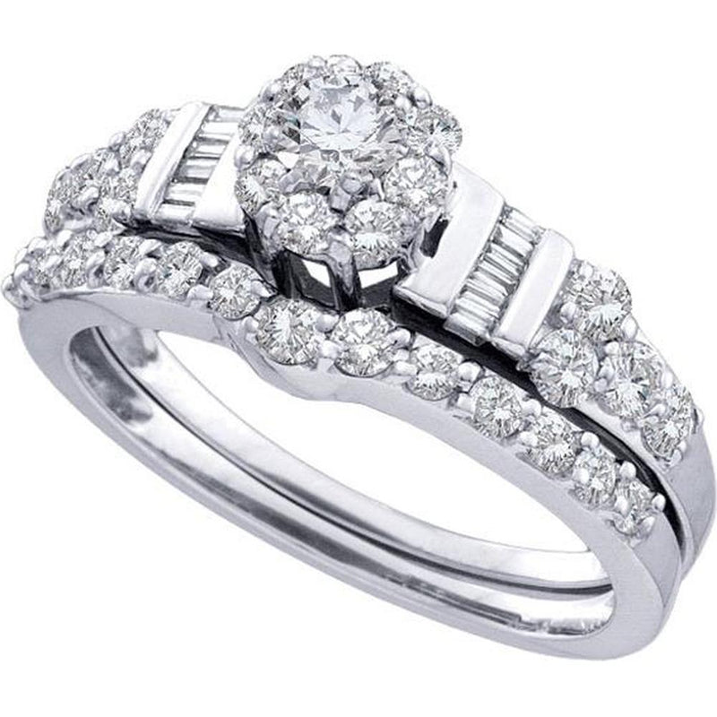 GND 14K White Gold Halo Bridal Wedding Ring Set with Prong-Set Round and Channel-Set Baguette Diamonds - 1.00 Carat Total Diamond Weight