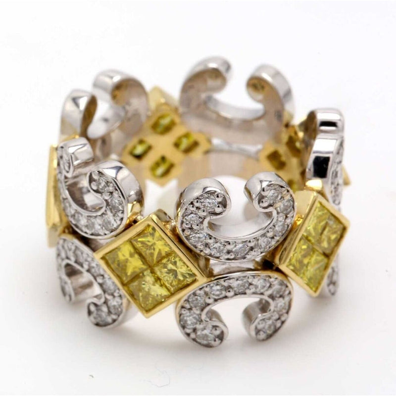 Mingle with the magic of elegance and sophistication when you slip this two-tone ring onto your finger. It's not just jewelry; it's a declaration of love, a promise of forever. With pave set rounds glistening like stars in the night sky and 2x2 invisible set FY princess cut diamonds, this ring is a masterpiece of craftsmanship, designed to capture hearts. The total diamond weight of 1.05 carats adds a touch of opulence that's impossible to resist.