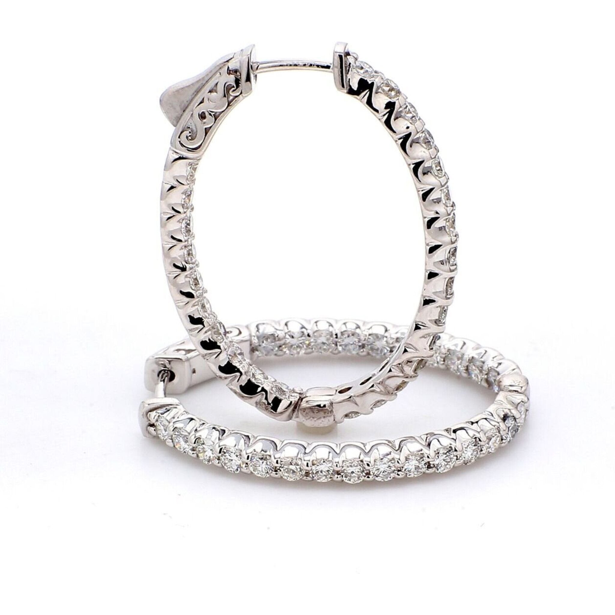 Radiate the room with the resonance of elegance and sophistication when you adorn yourself with these stunning 2" oval-shaped inside-out hoop earrings. Crafted with precision and passion, these earrings are a true embodiment of timeless beauty. The U-prong set round diamonds, with a total weight of 3.45 carats, sparkle with unparalleled brilliance, catching the light with every graceful sway.