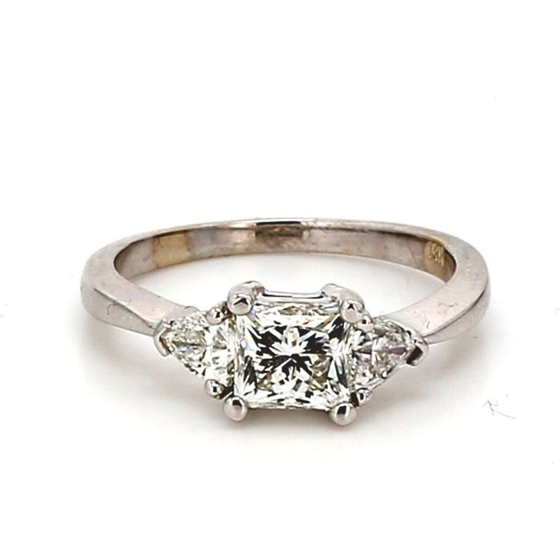 The beauty doesn't stop there – flanking the majestic princess cut are two trilliant diamonds, adding a unique touch to this already stunning piece. The interplay of shapes creates a harmonious symphony of light and radiance, making it perfect for any occasion, whether it's an engagement, bridal celebration, or a fashionable statement.