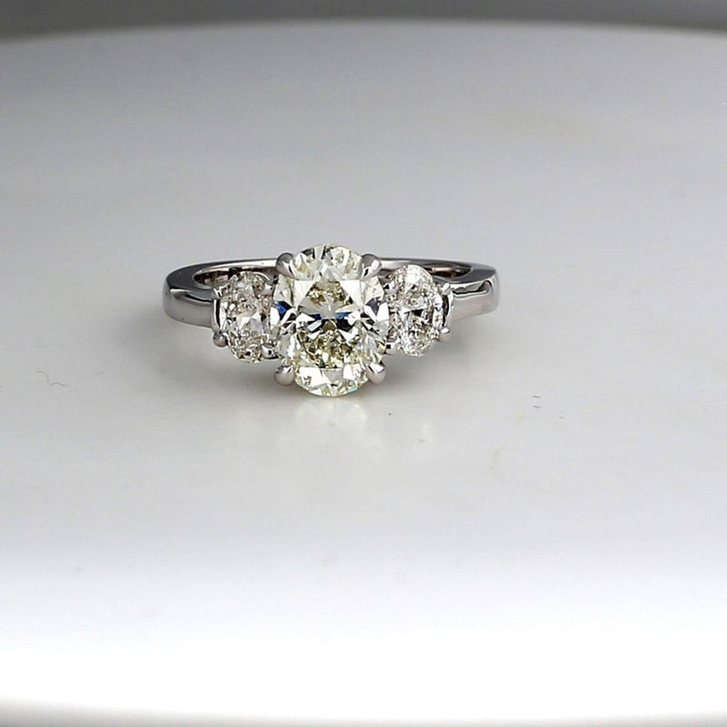 Step into a world of unmatched luxury with our exquisite 3-stone ring in white gold, a masterpiece designed to captivate your heart. This dazzling ring boasts a GIA-certified K/SI1 oval center diamond, radiating with brilliance and fire. Flanked by two equally enchanting oval diamonds, this symphony of sparkle creates a mesmerizing 2.65-carat total weight (with the center stone weighing 2.01 carats).