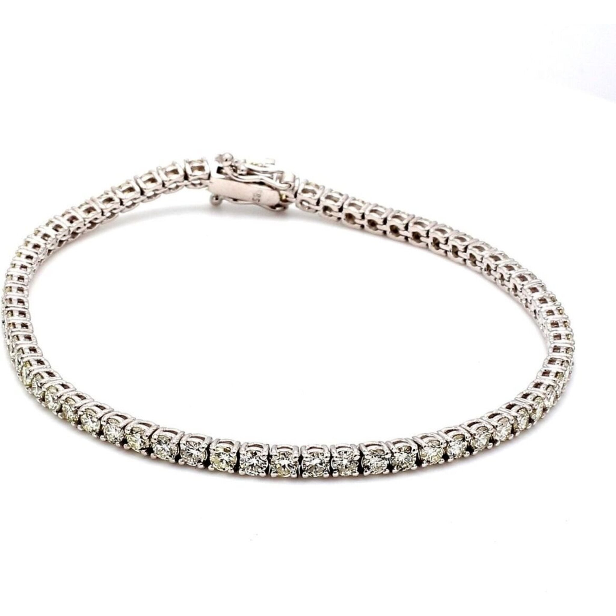 Picture yourself wearing this 7.25" masterpiece, adorned with a stunning array of 65 round diamonds, totaling an impressive 4.22 carats. Each diamond is meticulously placed in a secure 4-prong setting, allowing them to radiate with unparalleled brilliance and fire. The scintillating diamonds are set against a backdrop of lustrous 14K white gold, weighing a solid 8.6 grams.