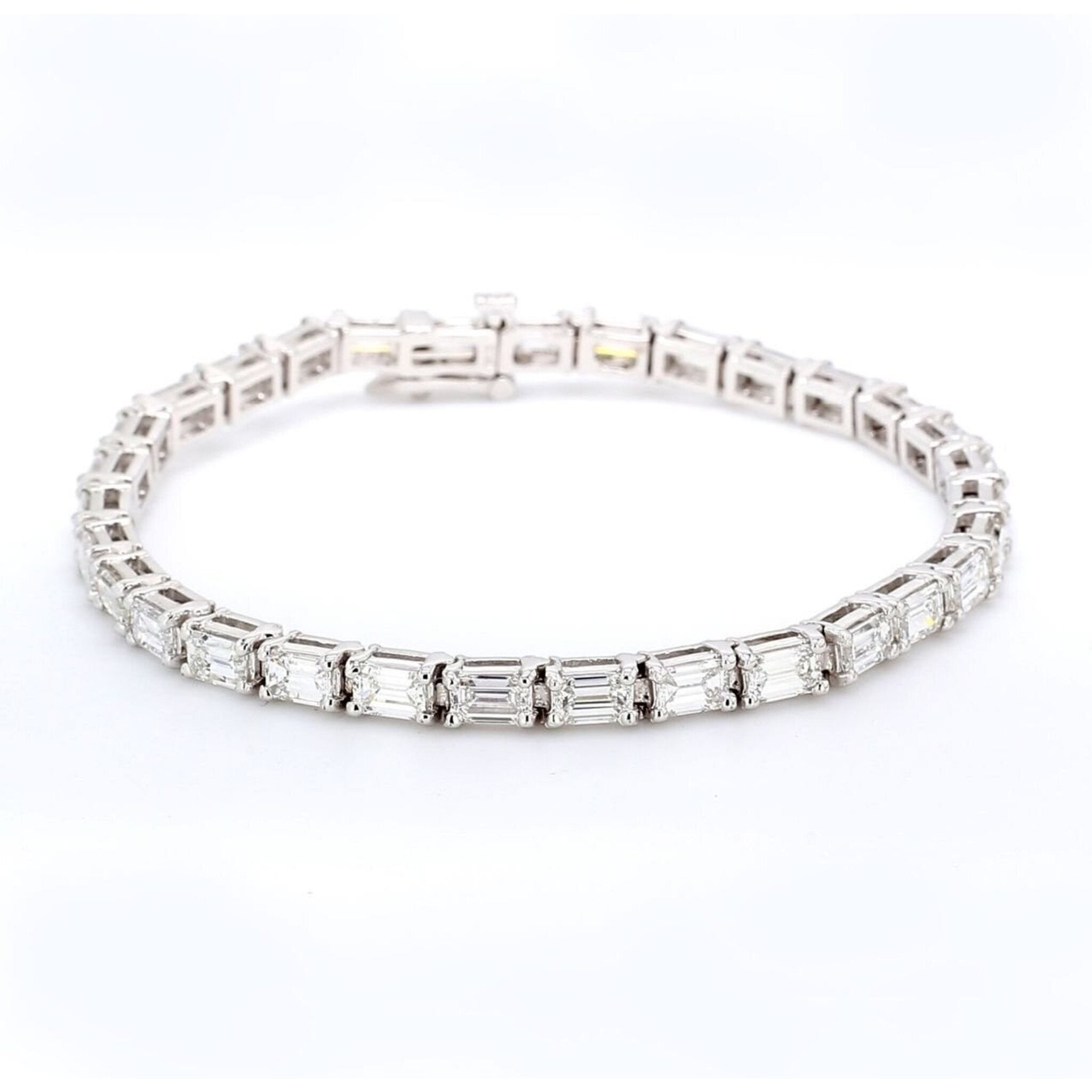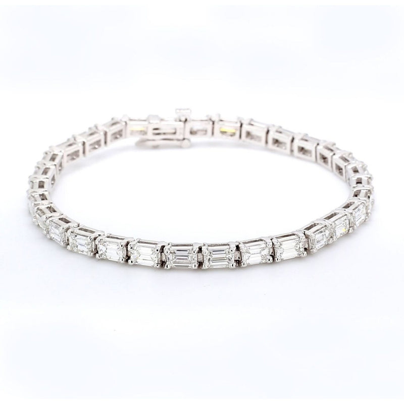 Crafted in lustrous 14K white gold, this bracelet carries a weight of 12.4 grams, ensuring both durability and luxury. The East to west style, coupled with the brilliance of emerald-cut diamonds, adds a contemporary twist to the classic tennis bracelet, making it a perfect choice for the modern, confident woman who embraces life with style.