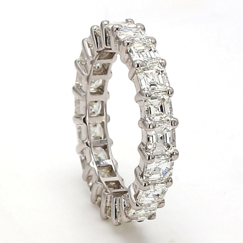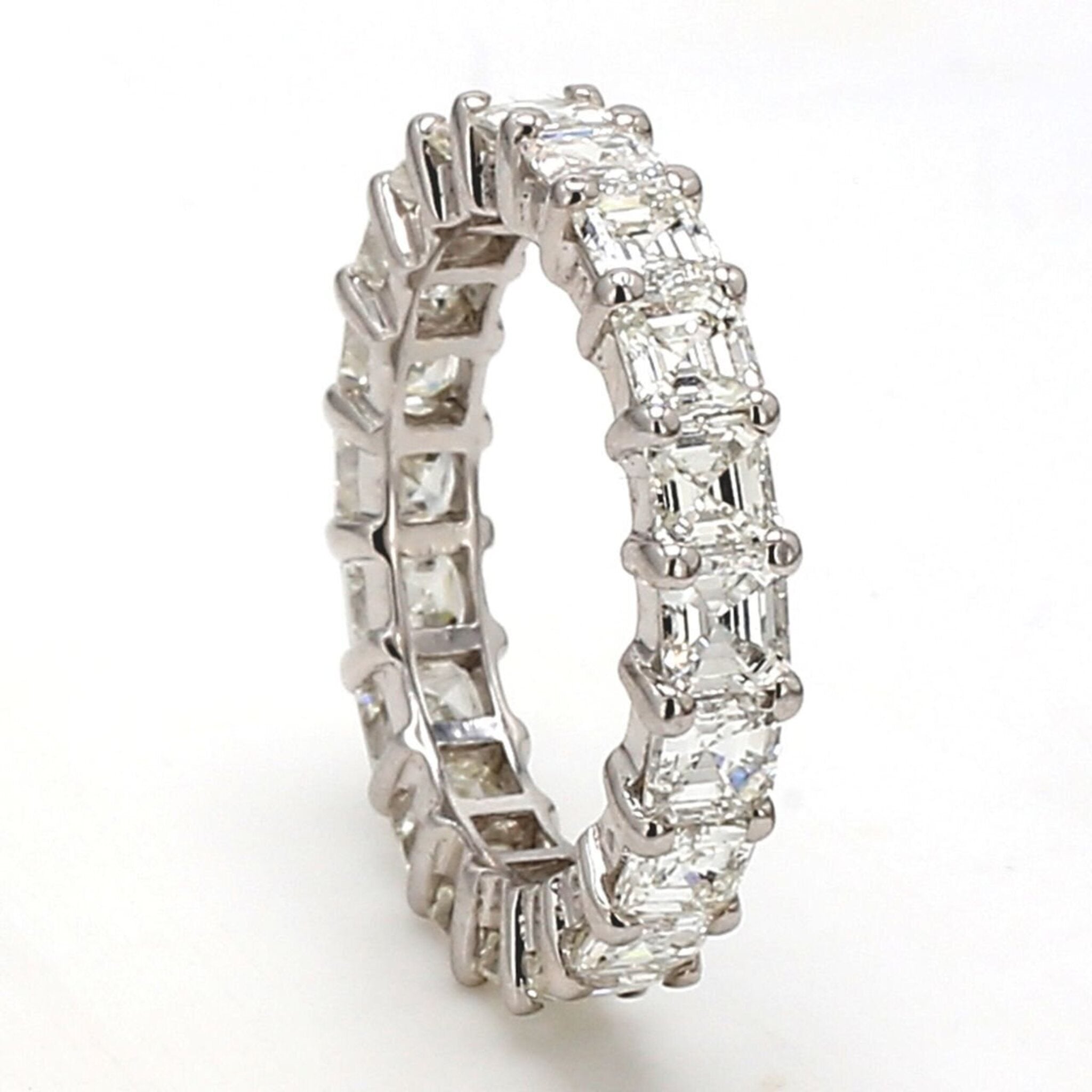 Turn heads with the brilliance of our Eternity band featuring shared prong set Asscher cut diamonds. Embodying sophistication and style, this exquisite piece boasts 20 stunning diamonds totaling 4.39 carats, creating a dazzling circle of light around your finger. Crafted in lustrous 14K white gold, this Eternity band weighs 4.1 grams, adding to its allure and comfort.