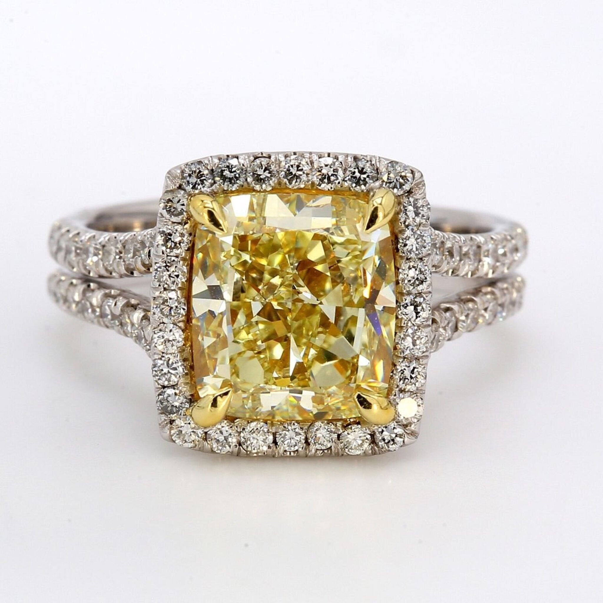 Twirl into the world of sophistication with our dazzling Halo Split-Shank Ring, a true masterpiece from the renowned Ninacci brand. Imagine the breathtaking beauty of a GIA certified Fancy Light Yellow (FLY) VS1 cushion cut diamond, the center of attention at 4.13 carats, surrounded by a delicate halo of French pave set rounds. This captivating ring boasts a total diamond weight of 5.05 carats, exuding an irresistible sparkle that will leave you spellbound.