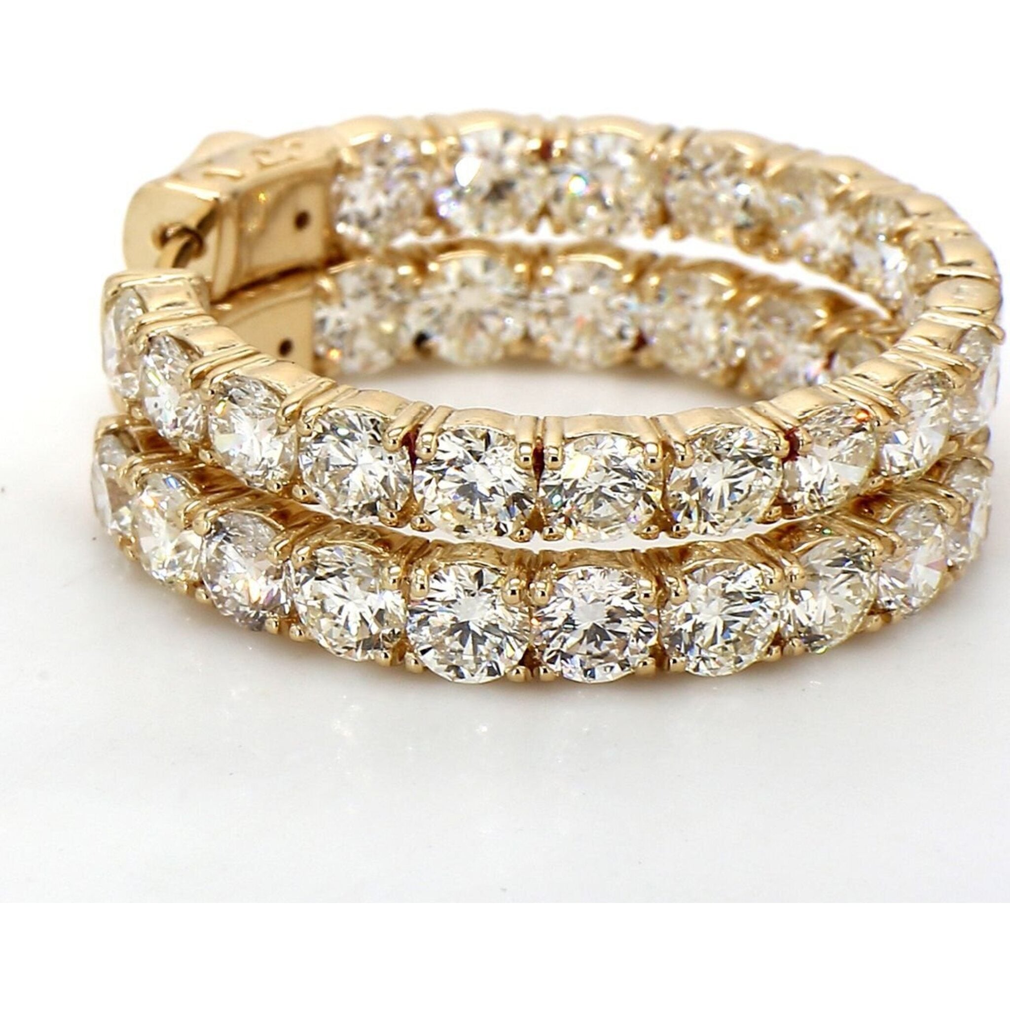 Travel through the tunnel of taste with these 1" Inside out hoop earrings in luscious yellow gold, adorned with a dazzling display of prong-set round diamonds, boasting a total weight of 8.12 carats. These earrings are not just an accessory; they're an embodiment of elegance and grace.
