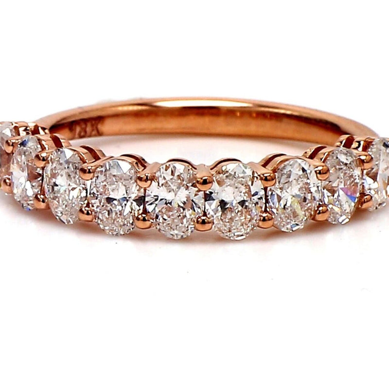 Indulge in the timeless allure of romance with our exquisite 9-stone band in 18K Rose Gold, adorned with the captivating elegance of oval-cut diamonds. This resplendent piece boasts a total diamond weight of 1.66 carats, each diamond cradled securely in a basket prong setting. Its size 7.5 fits comfortably on your finger, enhancing its appeal as an engagement ring, bridal adornment, or a stunning fashion statement.