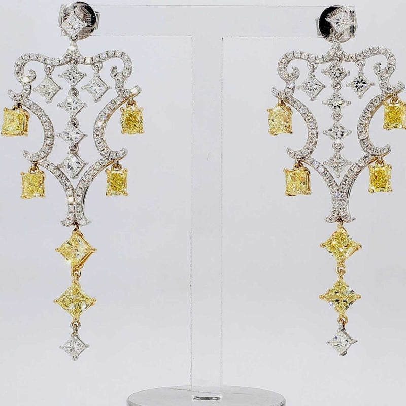 Linger in the luster of exquisite elegance with our 2" Pushback chandelier earrings, a true testament to opulence and sophistication. Crafted in 18K white gold, these earrings are adorned with a mesmerizing ensemble of white princess-cut and round diamonds, accentuated by a fancy yellow oval, radiant, and princess-cut diamonds, creating a scintillating dance of light and color. With a total diamond weight of 7.19 carats, these earrings exude unmatched brilliance and grace.