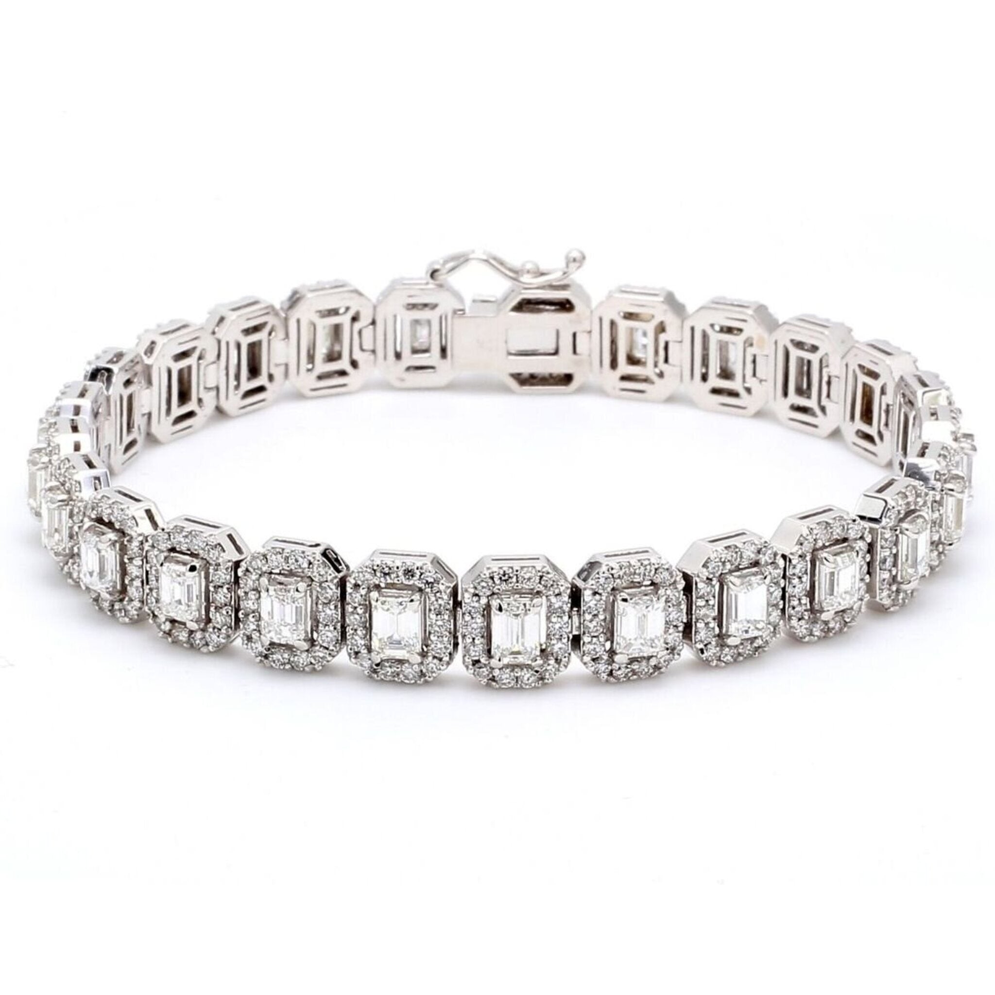 Ninacci 18K White Gold 7" Designer Halo Bracelet with 9.26 Carat Total Diamond Weight Emerald Cut Diamonds