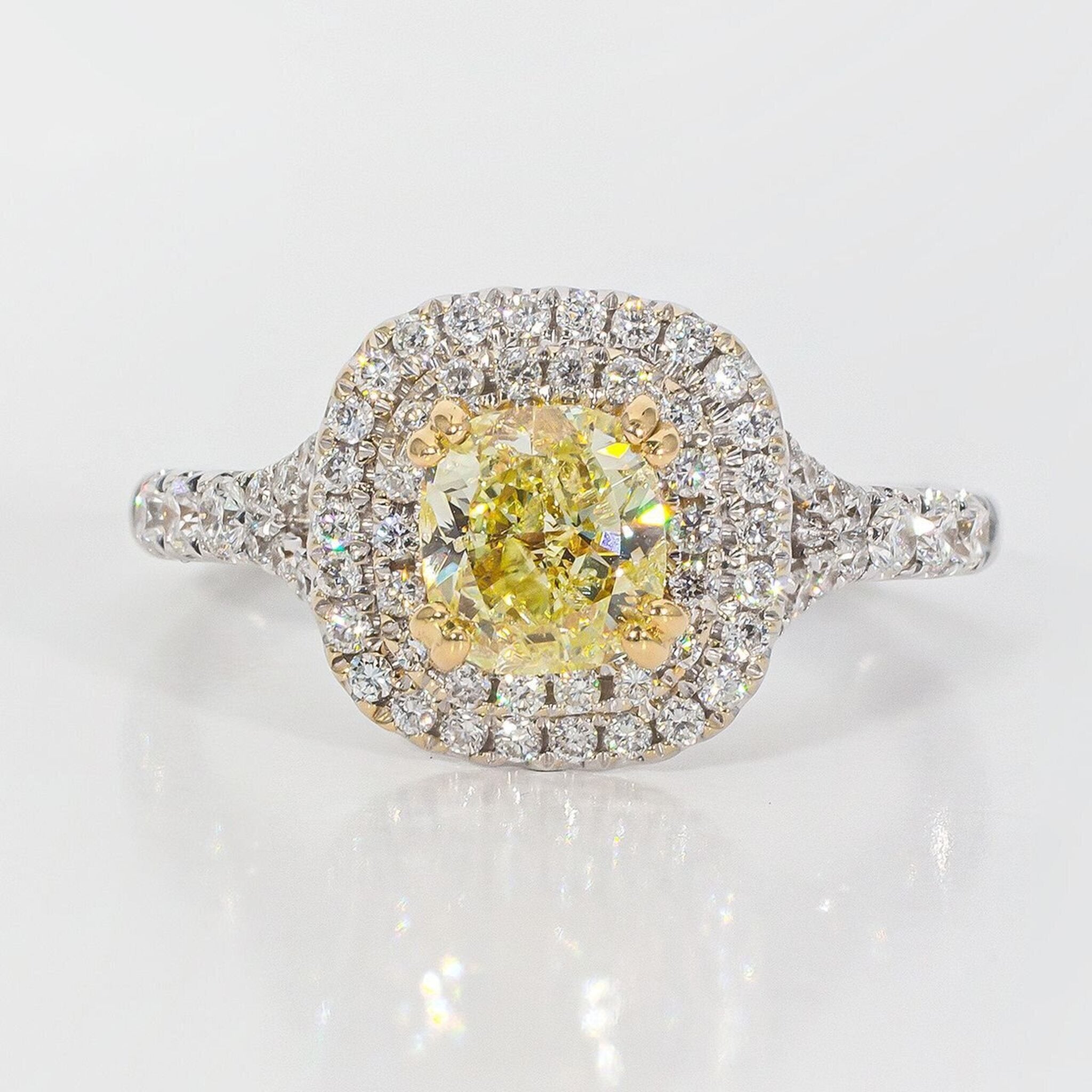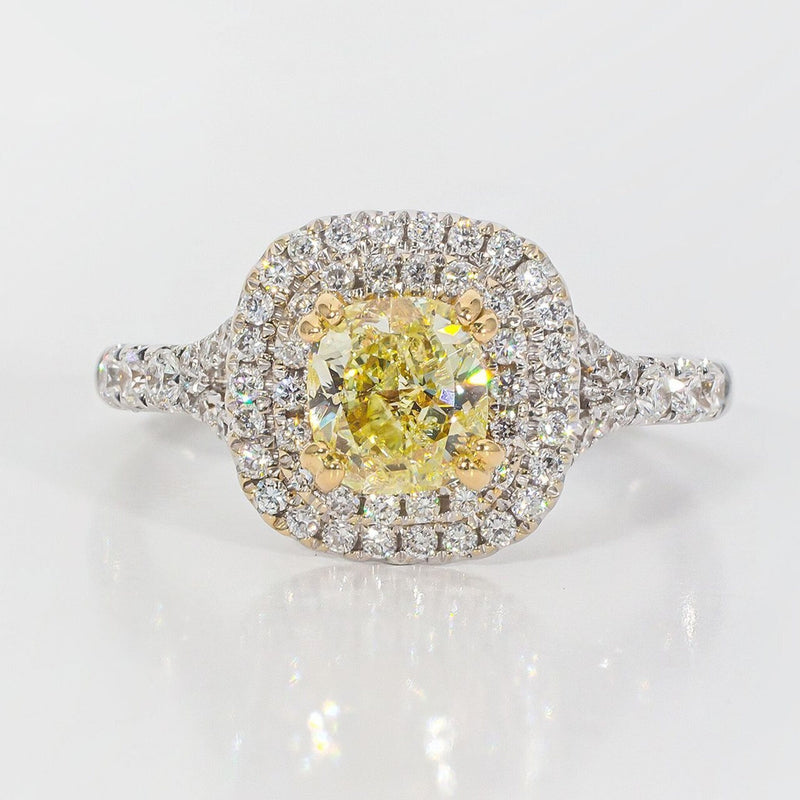 The star of this show is the dazzling FY cushion cut diamond at the center, weighing a brilliant 1.00 carat. It's surrounded by a halo of prong-set round diamonds that amplify its radiance. With a total diamond weight of 1.49 carats, this ring glistens from every angle.