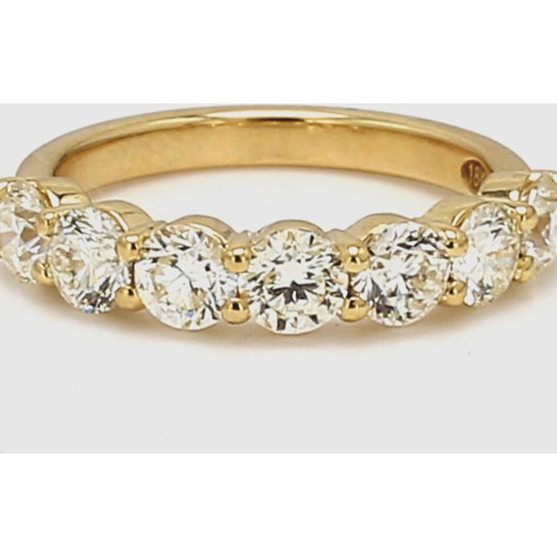 Uncover the utopia of uniqueness with our exquisite 7-stone band in 18K Yellow Gold, adorned with prong-set round diamonds. With a total diamond weight of 1.65 carats, this stunning piece exudes elegance and sophistication. Its size 5.5 makes it a perfect fit for any occasion, whether it's an engagement, bridal event, or a fashionable cocktail gathering. Crafted with a 3.4g metal weight and made from 18K gold, this ring is not just jewelry; it's a statement of timeless beauty.