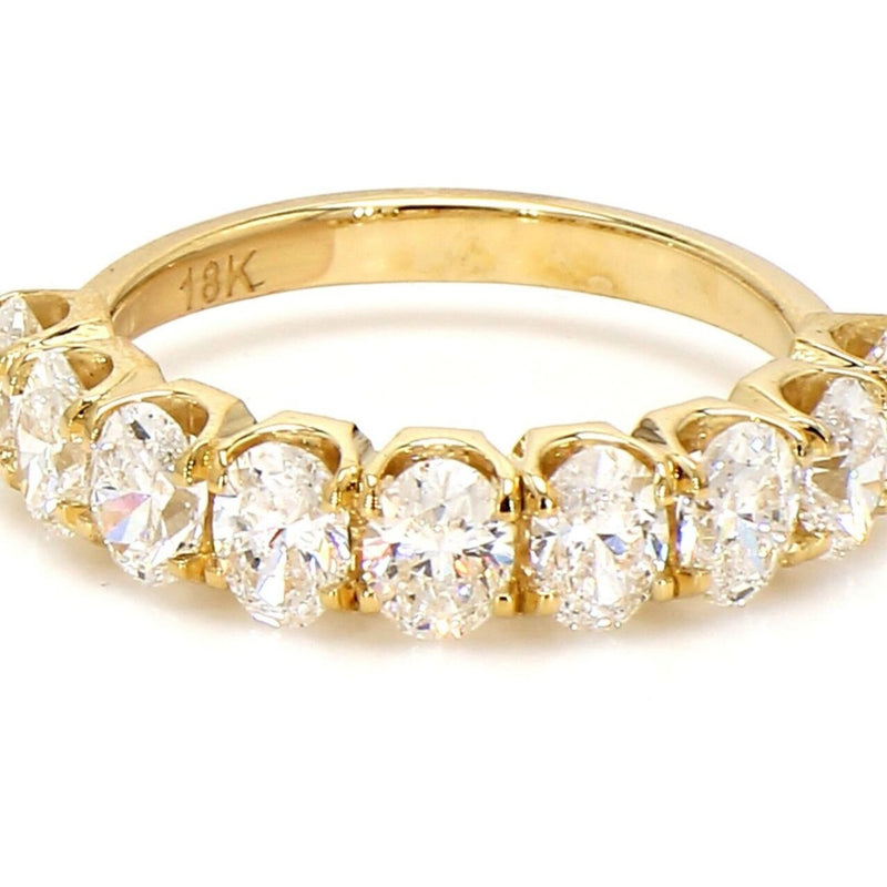 Indulge in the allure of our 9-stone band, a mesmerizing piece that captures the essence of sophistication and grace. Crafted in lustrous 18K yellow gold, this band features a shared prong set of oval cut diamonds, totaling 1.69 carats. Each diamond is meticulously selected for its exceptional brilliance and fire, adding a touch of celestial sparkle to your ensemble.