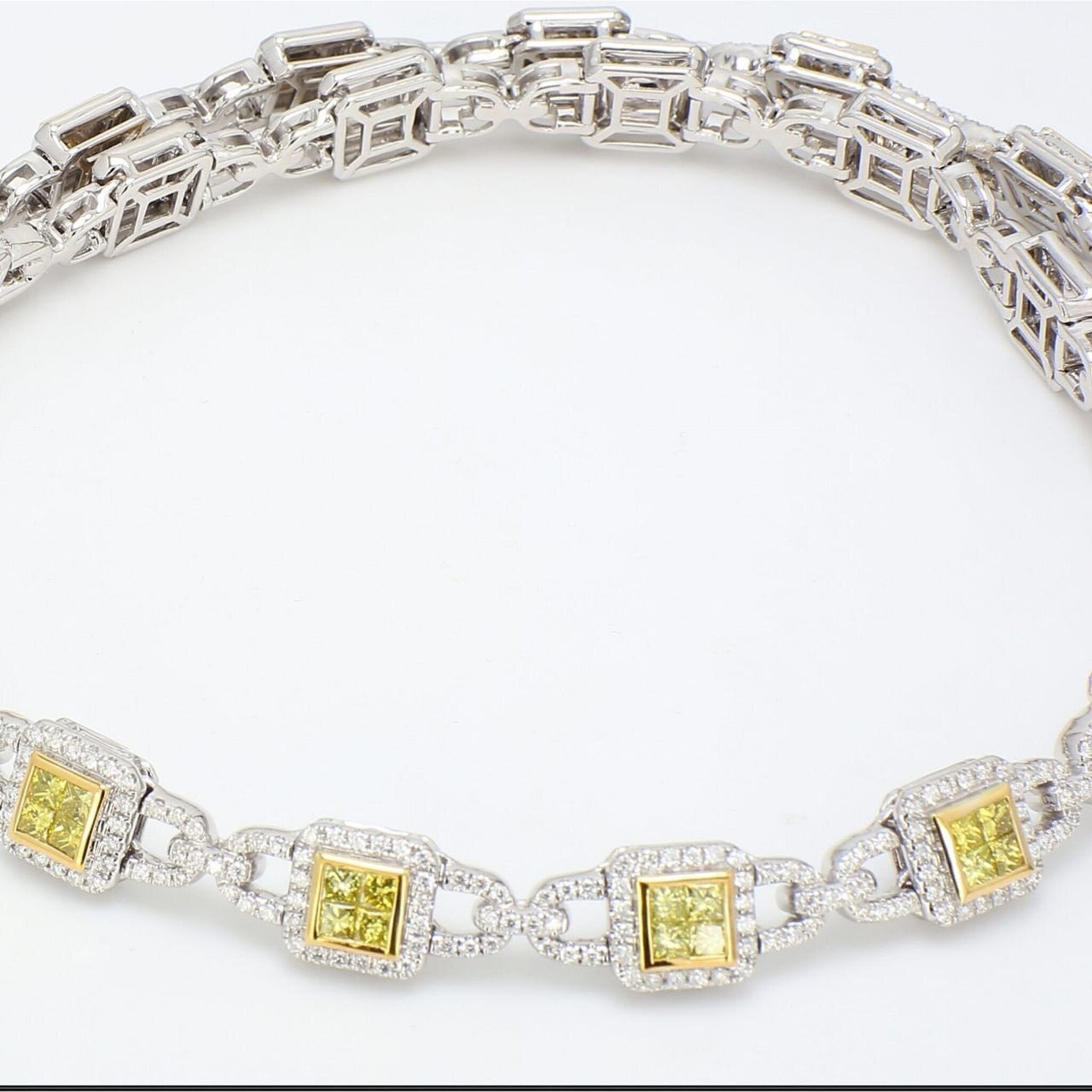 Revel in the rhythm of radiance with our exquisite Halo necklace, a breathtaking masterpiece that captures the essence of elegance and luxury. Crafted with precision and passion, this two-tone marvel features pave set round diamonds that shimmer like stars in the night sky, adorning your neckline with a celestial glow. What sets this necklace apart are the 2x2 invisible set fancy yellow princess cut diamonds, adding a pop of vibrant color and sophistication. With a total diamond weight of 5.61 carats, this necklace is a true testament to opulence and style.