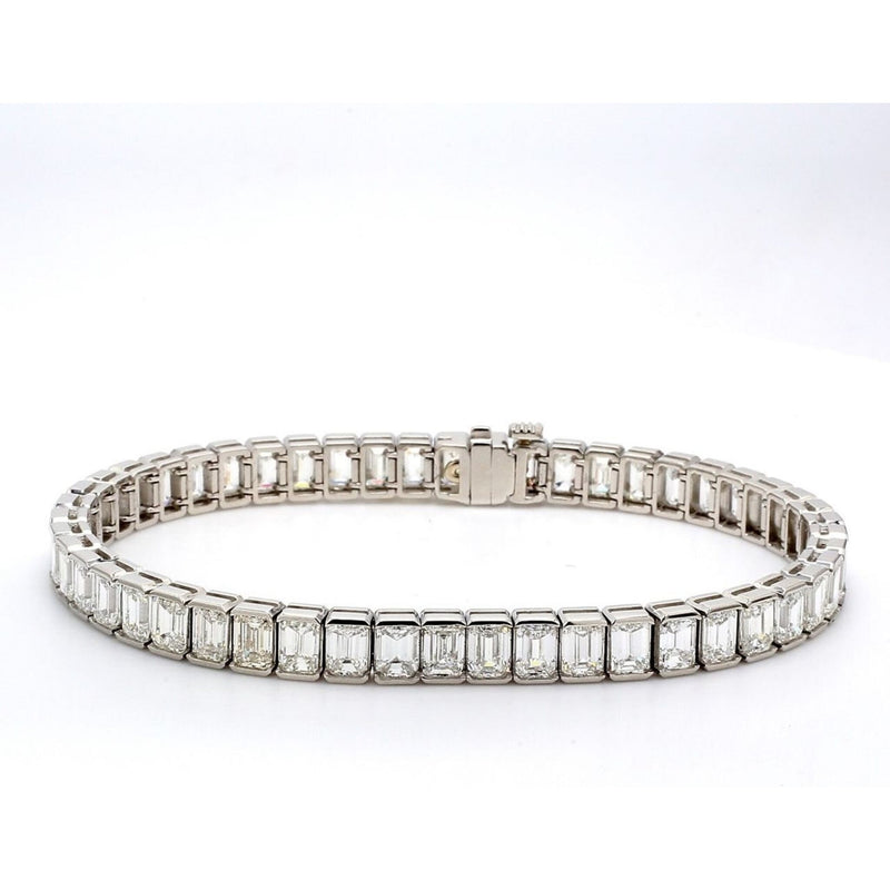 Elevate every moment with the allure of this exquisite 7" Tennis bracelet in platinum, a true masterpiece that's sure to steal your heart. Imagine the way it will gracefully adorn your wrist, catching the light with every movement, as its channel set (50) emerald-cut diamonds dazzle and dance with a total weight of 15.90 carats.