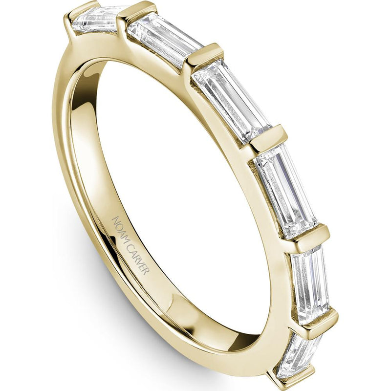 Embrace the grace of exquisite refinement with the Noam Carver Stackable Wedding Band, a true testament to timeless elegance and modern sophistication. Crafted from luxurious yellow gold, this stunning piece captures the essence of romance and everlasting love. The band is meticulously adorned with six baguette-cut diamonds, each precision-set to maximize their brilliance and sparkle. With a total carat weight of 1.02 carats, these diamonds radiate an unmatched luminosity, ensuring your ring shines brightly on every occasion.