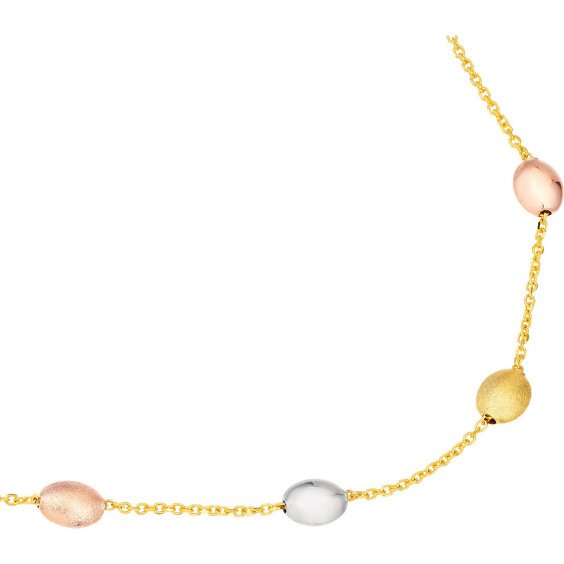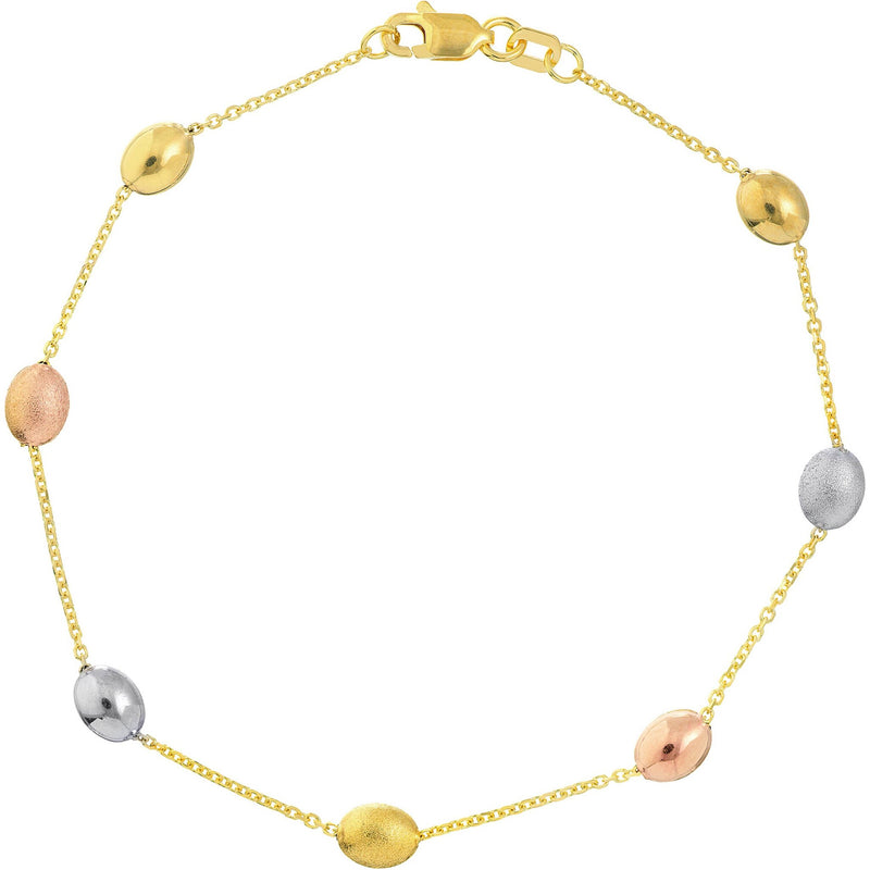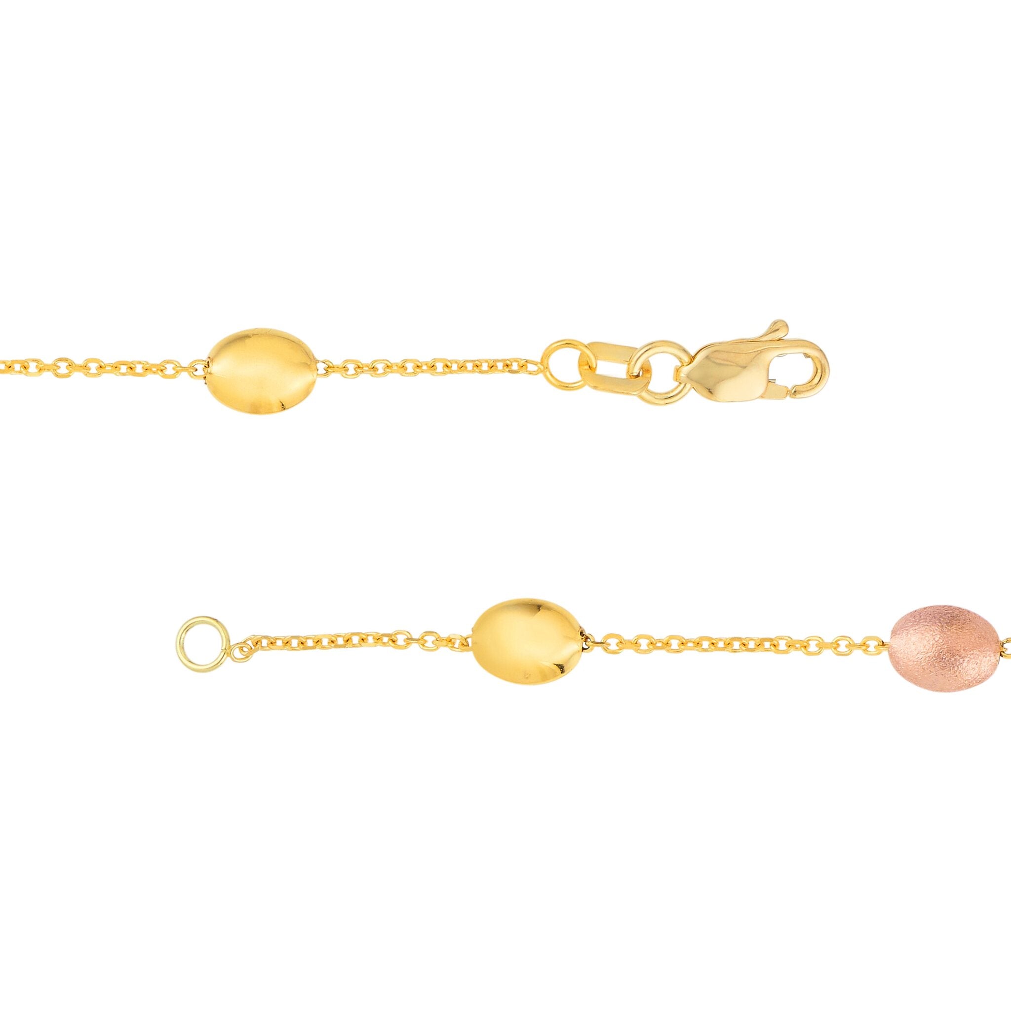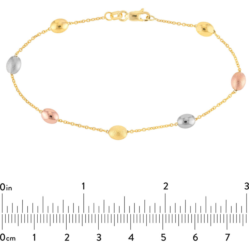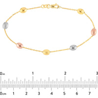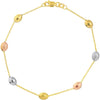 Experience the allure of three stunning gold colors - 14K yellow, rose, and white gold - elegantly combined in a puffy bead station bracelet. Each color represents a facet of your unique personality, allowing you to express yourself with timeless style.