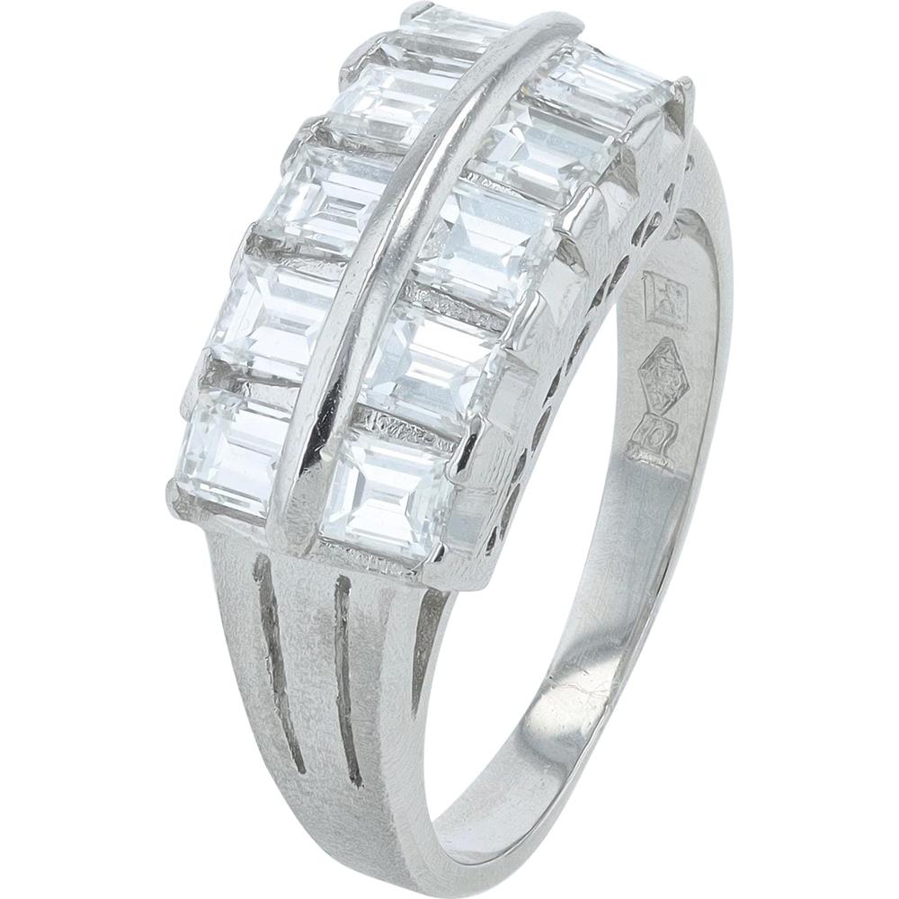 A luxurious platinum diamond ring featuring a bold and elegant design with a total of 1.21 carats of emerald-cut diamonds arranged in a striking stepped pattern. The ring has a sleek, modern profile with a unique bridge setting where two parallel rows of diamonds are held together by a central platinum band that cuts across horizontally, creating a dynamic architectural look. The diamonds are radiant and clear, highlighting their precise emerald-cut facets, which give the ring a sharp yet timeless sparkle. The platinum band is polished and substantial, adding to the luxurious feel of this sophisticated piece. The diamonds are set flush with the band, offering a seamless, sleek design, ideal for a confident, modern woman.