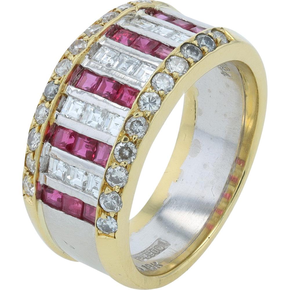 The allure of this stunning ring is undeniable. A breathtaking blend of fiery rubies and scintillating diamonds, this piece is crafted for the woman who understands the art of sophistication. The center of the ring features alternating rows of lustrous baguette-cut diamonds and vibrant rubies, their precise cuts creating a mesmerizing play of light and color. The diamonds, totaling 0.84 carats, shimmer with every movement, casting a radiant glow against the deep red of the 0.82 carat total weight rubies. Each stone is meticulously set within a luxurious platinum and 18K yellow gold band, blending modern elegance with timeless allure.