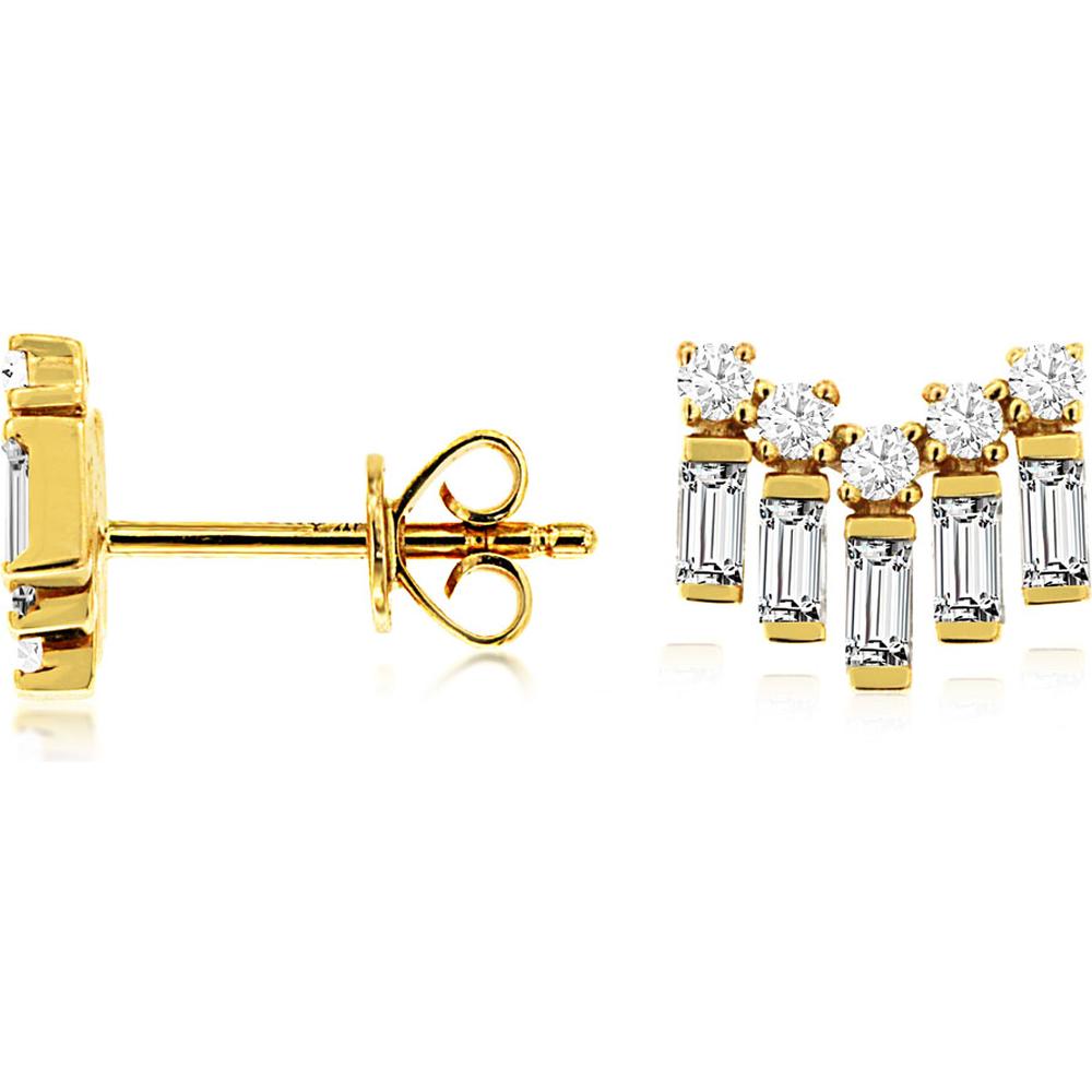 Uncover the vignette of vitality in these 14K Yellow Gold Diamond Earrings, a mesmerizing testament to timeless elegance. Adorned with a delicate arrangement of brilliant diamonds, these earrings shimmer with every movement, casting enchanting glimmers of light. The main stone, boasting a weight of 0.16 carats, captures attention with its radiant sparkle, while the accompanying 0.30 carat baguette diamonds add a touch of sophistication and allure. Set against the warm embrace of 14K yellow gold, these earrings exude a sense of luxury and refinement, perfe carat for any occasion. Whether worn as a statement piece or to complement other jewelry, these earrings are sure to elevate any ensemble with their exquisite beauty.