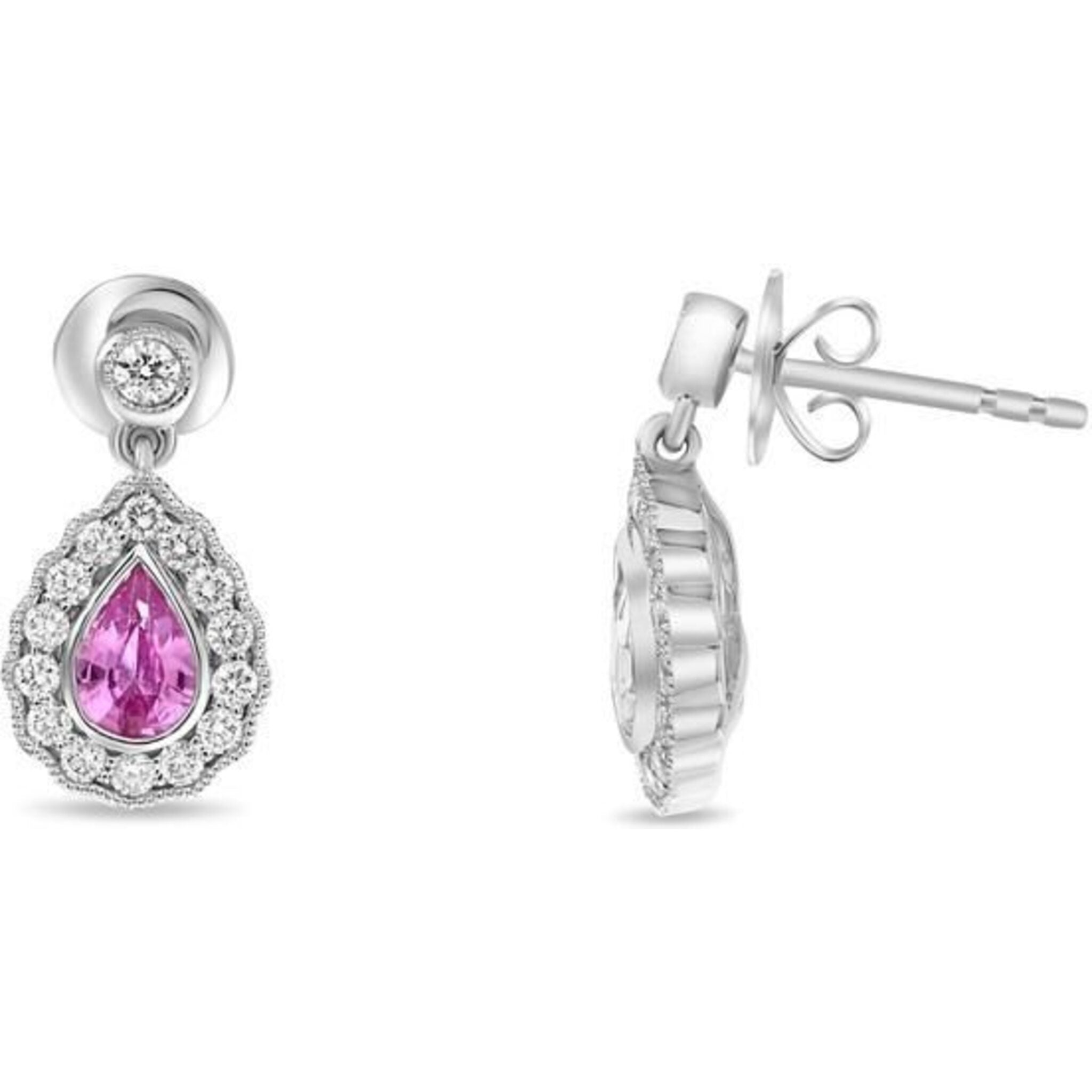 Unravel the mystique of these Pear-shaped Pink Sapphire Milgrain Halo Stud Earrings. Imagine adorning your ears with the captivating allure of 0.88 carats of pear-shaped pink sapphires, their vibrant beauty drawing everyone's attention. But that's not all – these exquisite gems are encircled by a resplendent halo of 0.48 carats of white diamonds. The intricate milgrain detailing adds a touch of vintage charm to these modern-day marvels.
