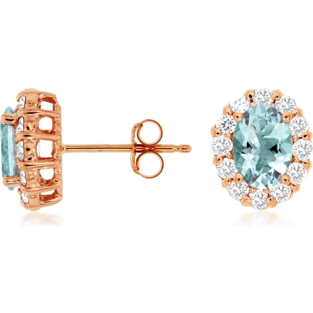 Royal 14K Rose Gold Aqua & Diamond Halo Stud Earrings - 1.35 Carat Aquamarine, 0.60 Carat Total Diamond Weight
