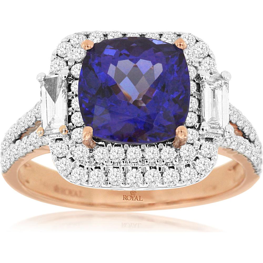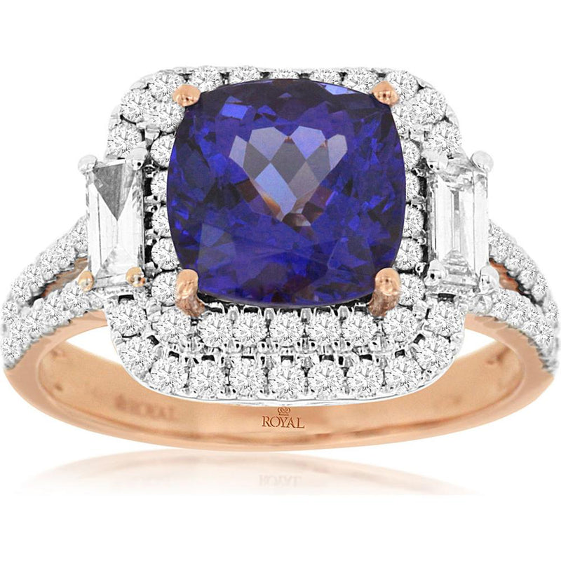Royal 14K Rose Gold Ring with 2.70 Carats Cushion-Cut Tanzanite and 0.85 Carats Total Baguette and Round Diamonds