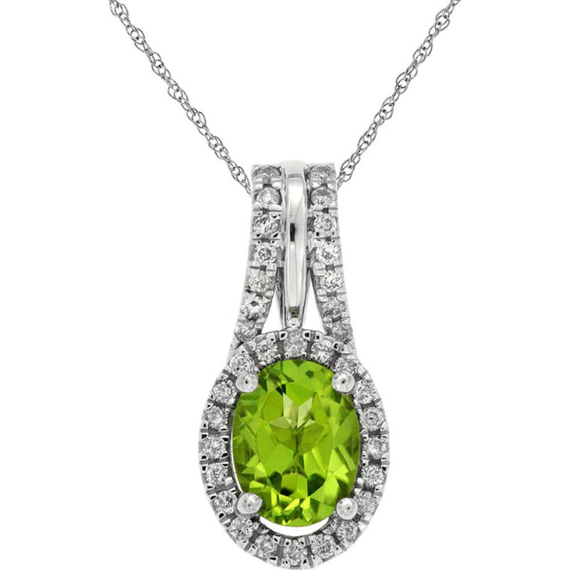 Oscillate in the orbit of opulence and originality with the mesmerizing allure of our 14K White Gold Peridot & Diamond Pendant. Embellished with a resplendent 1.25 carat oval peridot, this pendant emanates a captivating verdant glow, evoking the freshness of springtime blossoms. The peridot's lush hue is accentuated by a delicate halo of sparkling diamonds, totaling 0.24 carats, ensconced in a luminous 14K white gold setting. Crafted with exquisite artistry, this pendant exudes elegance and sophistication, making it the perfe carat embodiment of timeless beauty. Adorn yourself with this enchanting piece and bask in the admiration it commands, a true testament to refined taste and discerning style.
