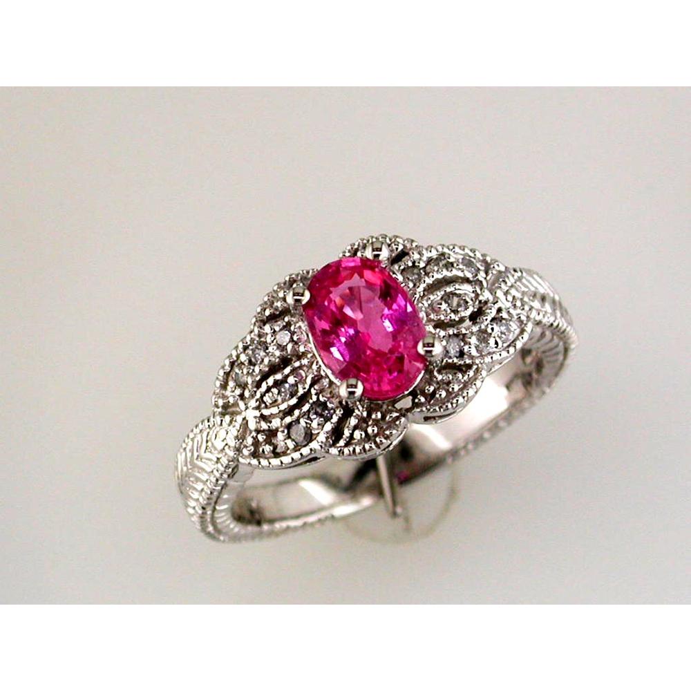 The ornate design celebrates the allure of vintage-inspired craftsmanship while offering the sophistication of contemporary jewelry. The white gold setting not only complements the pink sapphire but also accentuates the fire and brilliance of the diamonds, making this ring a breathtaking accessory for any occasion. Whether you're seeking a symbol of love, a gift for yourself, or a statement piece that stands out in a crowd, this ring fulfills every desire for elegance and luxury. The delicate prong setting holds the stones securely while allowing maximum light to pass through, ensuring that both the pink sapphire and diamonds radiate unmatched brilliance.